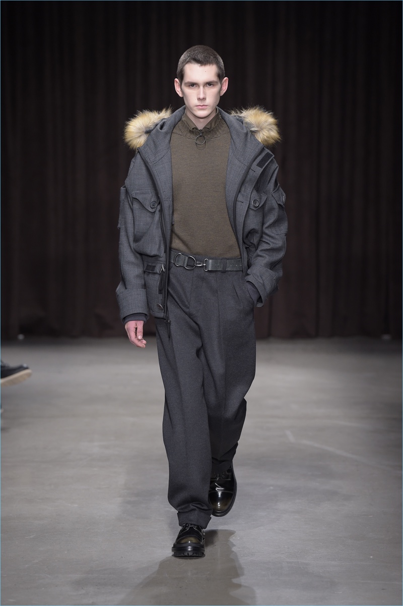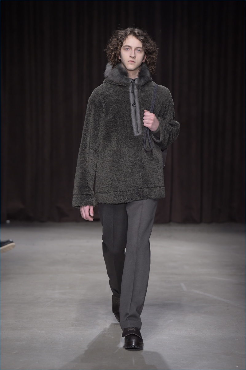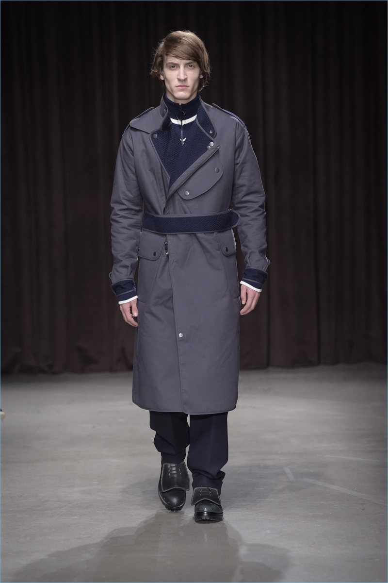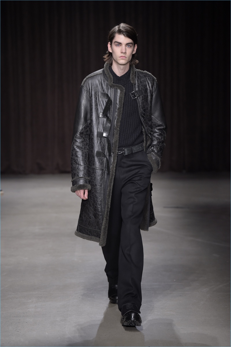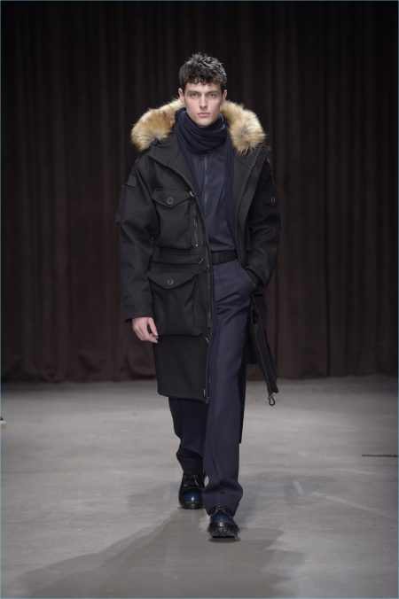 New York Fashion Week: Men serves as the backdrop for the unveil of BOSS Hugo Boss’ fall-winter 2017 collection. Adventures and voyages inspire the outing as the German brand looks to outfit the modern traveller. Tailoring grounds the range with wide silhouettes referencing the 1980s and 90s. Breaking up the clean lines of suits, BOSS tackles a maritime theme. On the material front, BOSS delivers a mix of bonded leather and boiled wool. Here, buckled straps and hardware update traditional peacoats and duffle coats.
