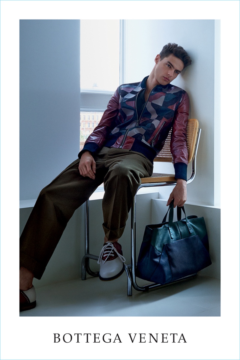 Hannes Gobeyn sports a multi-color leather bomber jacket with pleated trousers for Bottega Veneta’s spring-summer 2017 campaign.