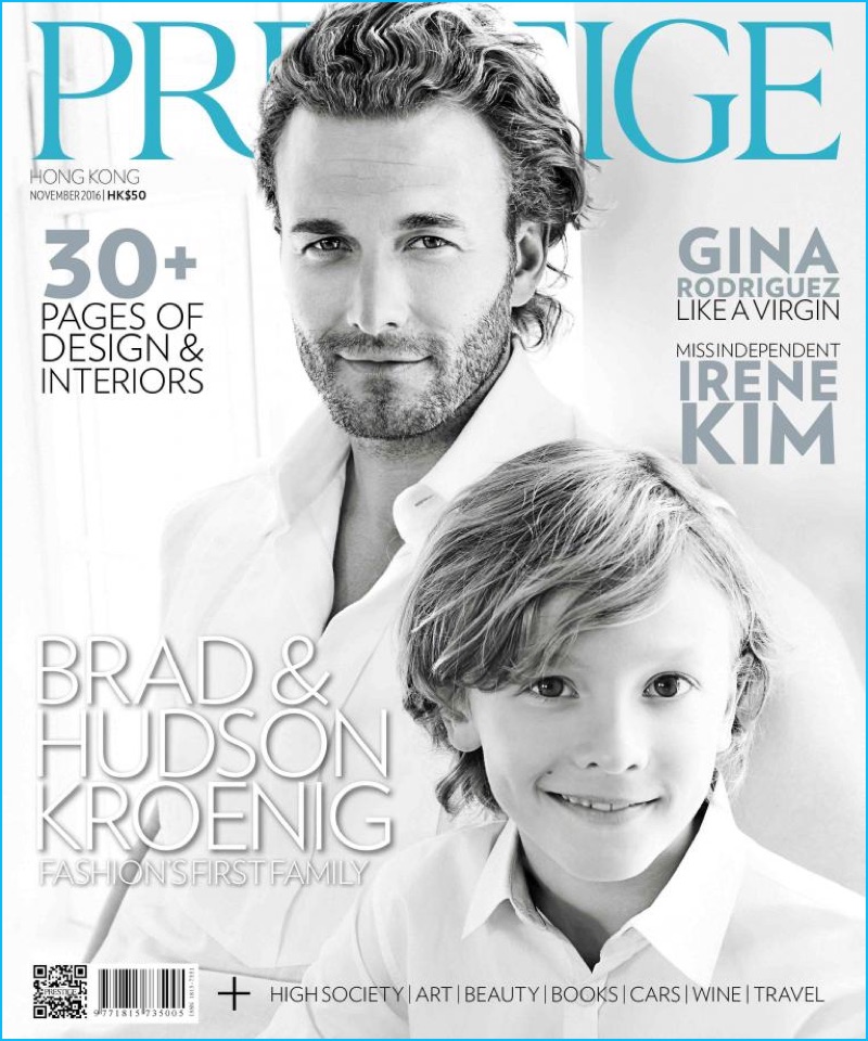 Top model and Karl Lagerfeld muse, Brad Kroenig covers the November 2016 issue of Prestige Hong Kong. Kroenig joins his 8-year-old son, Hudson for the cover. Photographer Giovanni Squatriti also captures Kroenig’s 5-year-old son, Jameson for the feature. Looking to the designs of Karl Lagerfeld for inspiration, stylist Giuseppe Ceccarelli outfits Brad and Hudson in Chanel.