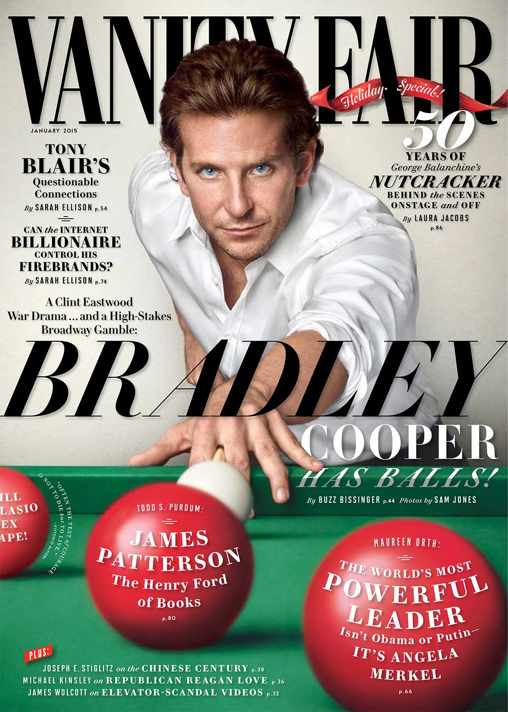 Actor Bradley Cooper has laser focus for the January 2015 cover of Vanity Fair. Photographed by Sam Jones, Cooper is captured in a white dress shirt, playing a game of pool. Covering the issue, the American actor promotes his latest film project, American Sniper, which was directed by Clint Eastwood. The movie hits US theaters January 16, 2015.