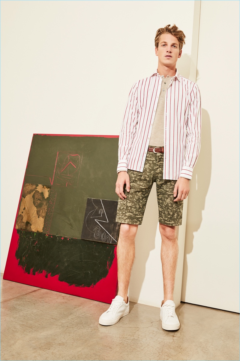 Embracing summer vibes, Hugo Sauzay wears a linen shirt and floral print shorts by Brooksfield.Pin
