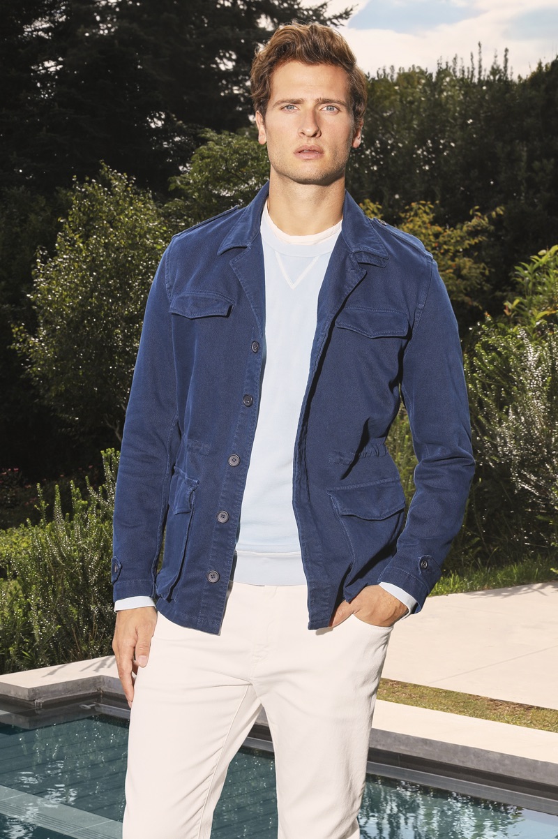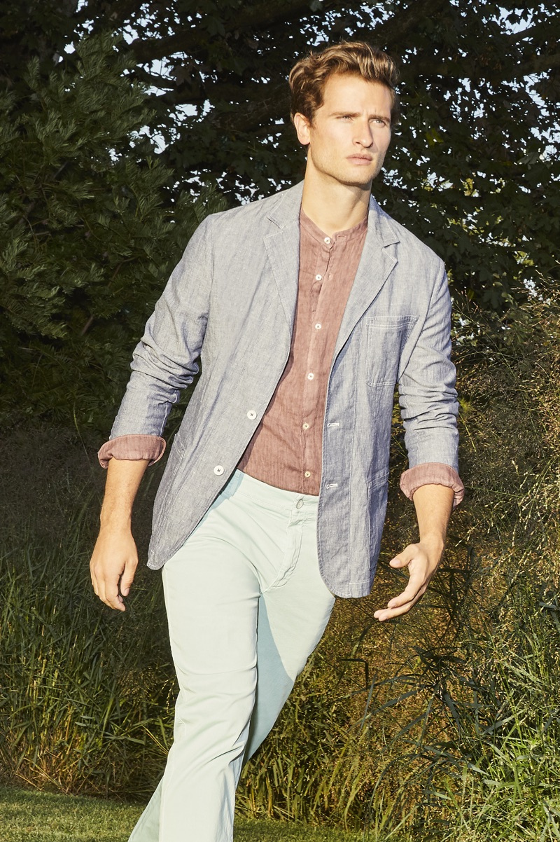 Brooksfield taps Tom Warren as the face of its spring-summer 2019 campaign. Embracing smart style, Tom ventures outdoors for the occasion. Front and center, Tom sports key pieces, which include tropical print shirts and shorts. Wearing a variety of menswear such as linen tailoring and a band-collar shirt, Tom appears in the season’s complementary lookbook as well. A summer vibe reigns with muted colors and a selection of shirts, tees, and more.