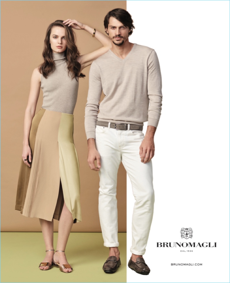 Bruno Magli enlists models Romulo Pires and Polina Grebeniuk to star in its spring-summer 2017 campaign. Hitting the studio in soft seasonal hues, the pair appears before the lens of photographer Nino Muñoz. Stylist Katie Mossman outfits Romulo in dashing suits and smart sportswear. Romulo’s wardrobe complements Bruno Magli’s latest line of footwear. Offering rich colors and textures, the featured shoes include woven suedes, leathers, and silks. / Hair by David Von Cannon. Makeup by Rose-Marie Swift.