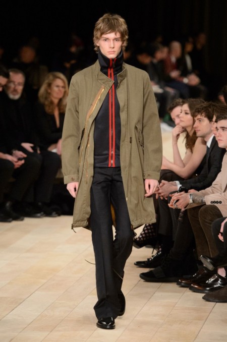 Burberry took embraced a military style motif for its fall-winter 2016 menswear collection. Juxtaposing formal and casual elements, sharp tailored outerwear was mixed with a cheeky take on the tracksuit. Adding a splash of glitz, several tracksuits had sequined embellishments.
