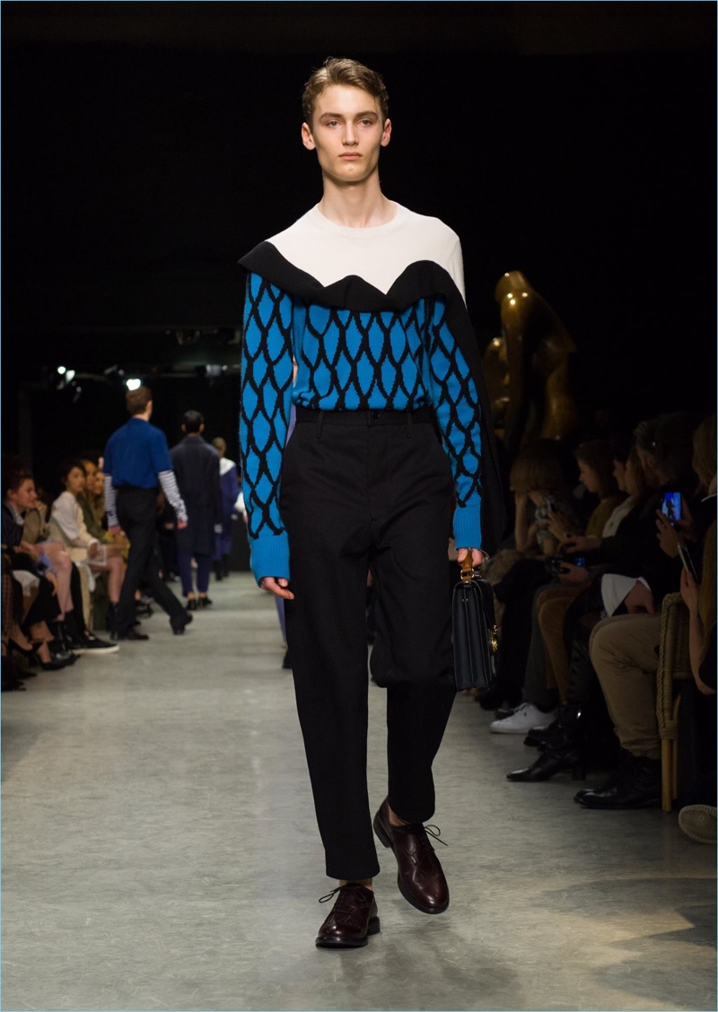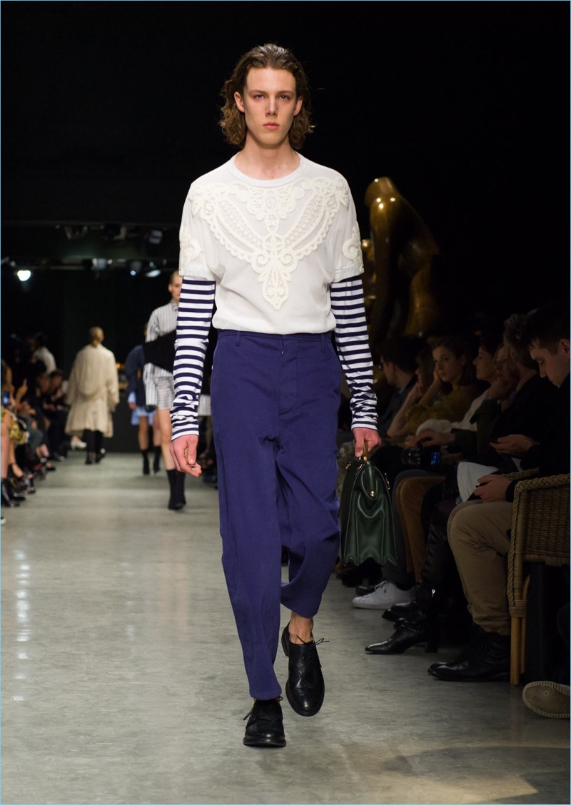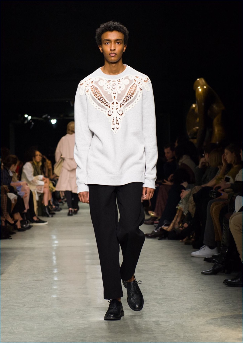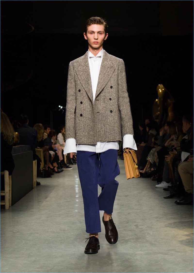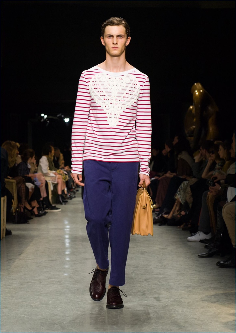 A neutral color palette accents nautical blues for the occasion. Experimenting with elongated sleeves, Bailey delivers pullovers, knitwear, and elegant button-downs. Additional hero pieces for the season range from tailored coats and cropped sweatshirts to relaxed trousers. Shop the collection now on Burberry.com.