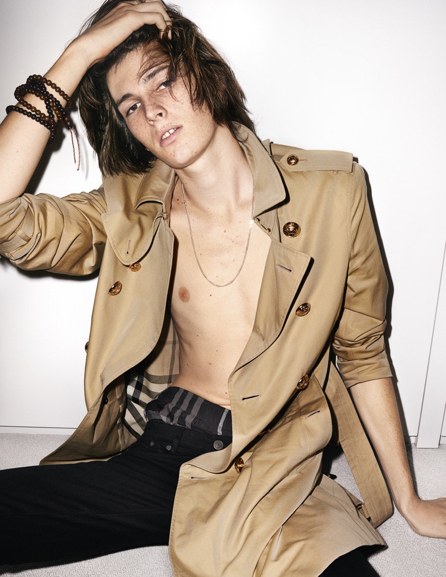 Posing for a casual image, Dylan is photographed by the legendary Mario Testino. Wearing one of Burberry’s iconic trench coats, Dylan adds a modern edge in black skinny jeans that reveal the waistband of the label’s check boxer shorts.