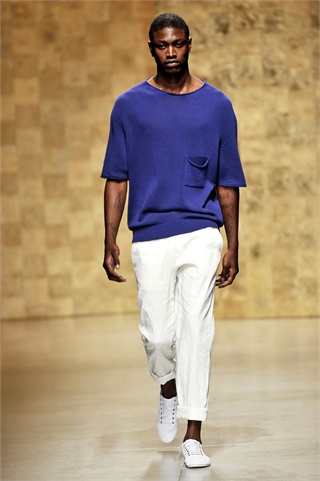 Taking a look back at Saturday we find C.P. Company’s first showing under the guardianship of former Galliano menswear designer Wallace Faulds. It was, as anticipated, an exercise in sleek simplicity for a label tailored towards the man on the go. With its design aesthetic that emerged almost thirty-five years ago from a consideration of uniform and working clothes, and an interest in the tension that exists between elegance and function, one can never expect the type of adventure that Vivienne Westwood provides to grace a C.P. Company collection. Nonetheless, for a design house that prides itself on focusing on volume and fabric, and that has a ‘jealously protected’ research colour lab, their spring offering was not so much simple (the way in which Raf Simons’ intriguingly minimalist collection for Jil Sander was ‘simple’) as simplistic. The collection for the modern working man saw an array of straightforward silhouettes comprised of outerwear and relatively loose-fitting tops (note, however, the diversity in necklines/collars) offset by tapered trousers that signaled C.P. Company’s love affair with the rolled cuff. While there were fabrics aplenty – cotton, nylon, denim, linen, and even suede in the shoes – they missed being used in thought-provoking ways; the patterned camp shirts, too, were a misstep. The assorted use of over-sized pockets which appeared on cardigans, T-shirts, sweaters and hooded outerwear served as a point of interest, but the starring role was won by the colour palette: a bevy of blues bounded by beige and buff. We saw light sky blue pants, Persian indigo shorts, duke blue windbreakers and azure cardigans supported by a beige trench and buff outerwear. Still, though, for all this seeming freshness, it became clear that an interest in workwear and uniforms has inspired a label whose latest collection is just that–uniform.
