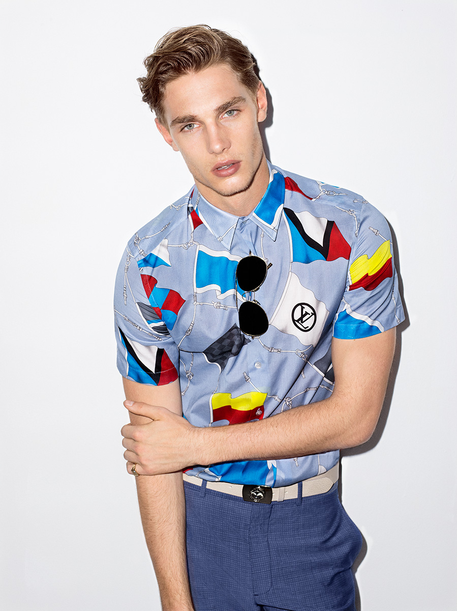 Tommy Marr is front and center in a vibrant patterned shirt from Louis Vuitton menswear.