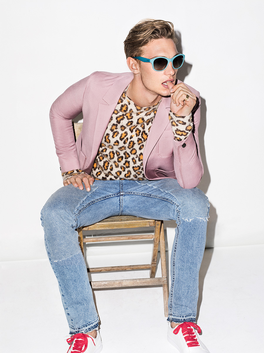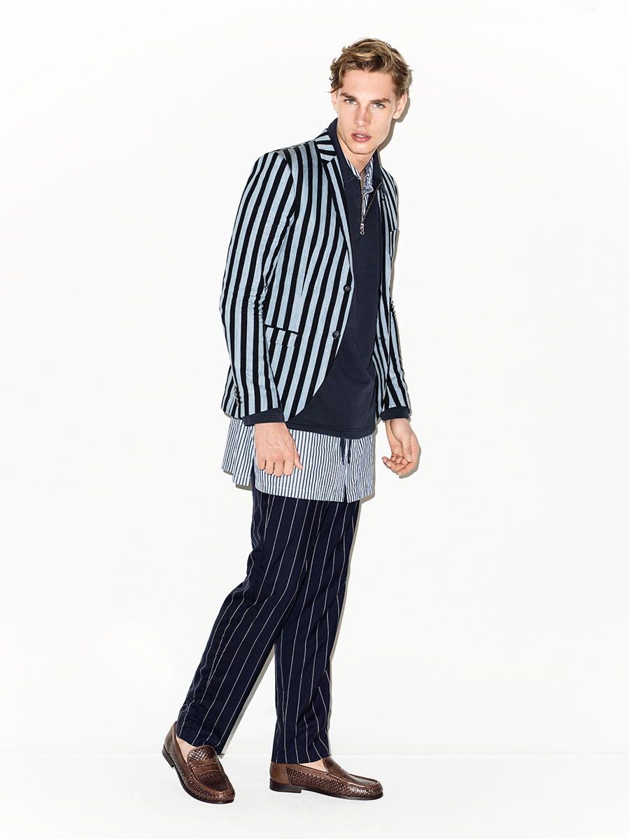 Playing with stripes, Tommy Marr is photographed in a Tiger of Sweden blazer with GANT Rugger trousers and an enlongated shirt from Acne Studios.Pin