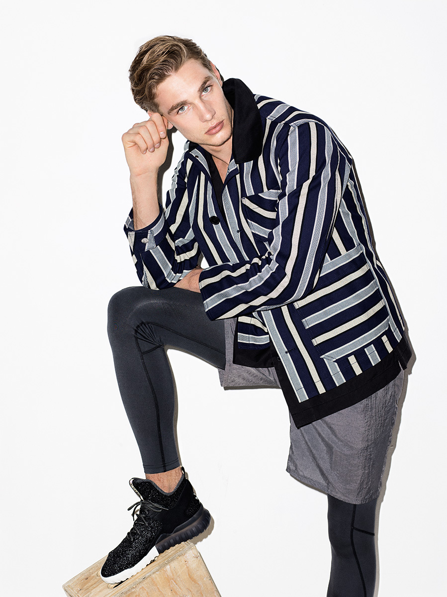 Going sporty in leggings and Tiger of Sweden shorts, Tommy Marr completes his look with a stripe jacket from Acne Studios.