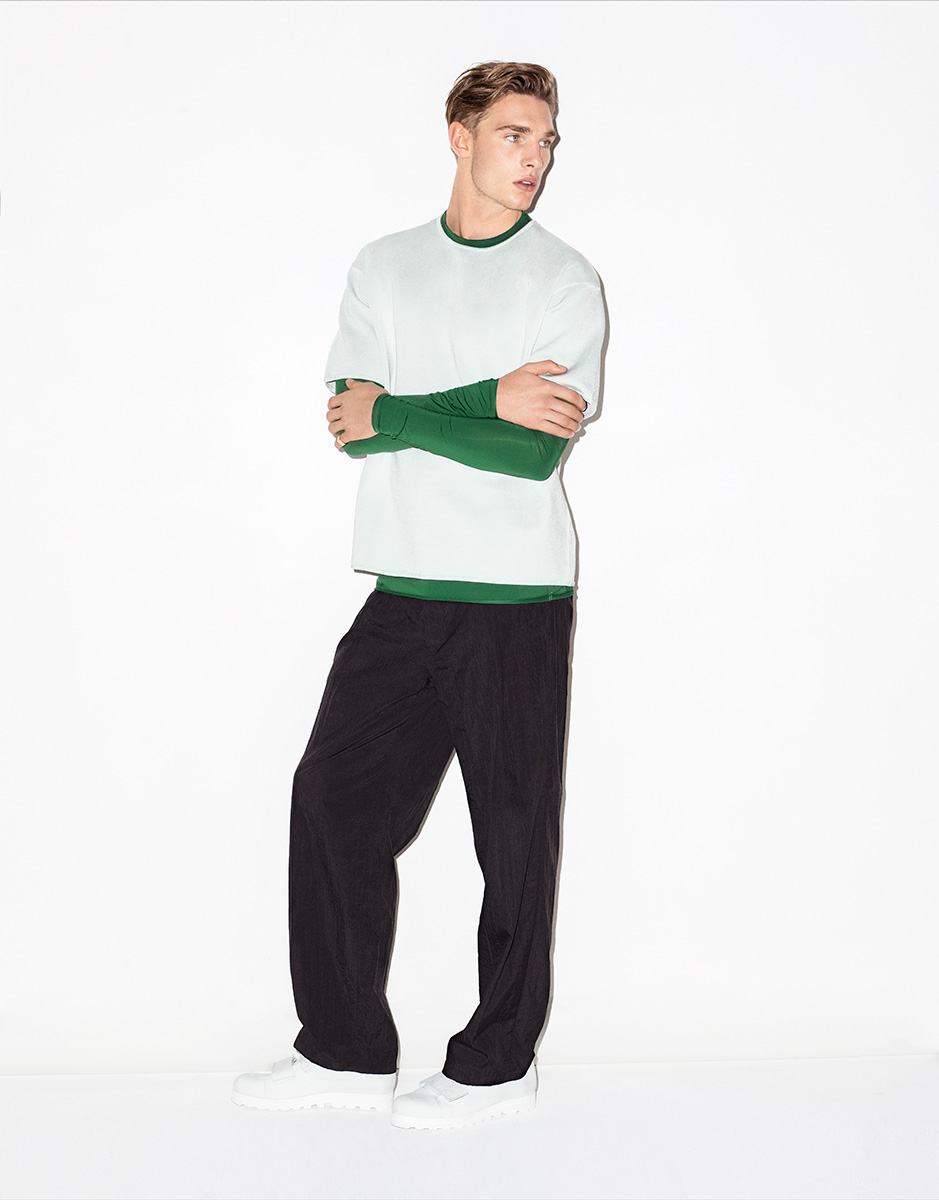 Tackling contemporary ensembles, Tommy doesn’t shy away from color, wearing various fashions such as a pink ensemble from Our Legacy and an Acne Studios teal leather jacket. Honing in on stripes, the men’s standard gets an update, courtesy of layered long proportions. Meanwhile, the sporty aesthetic reemerges with leggings and shorts.