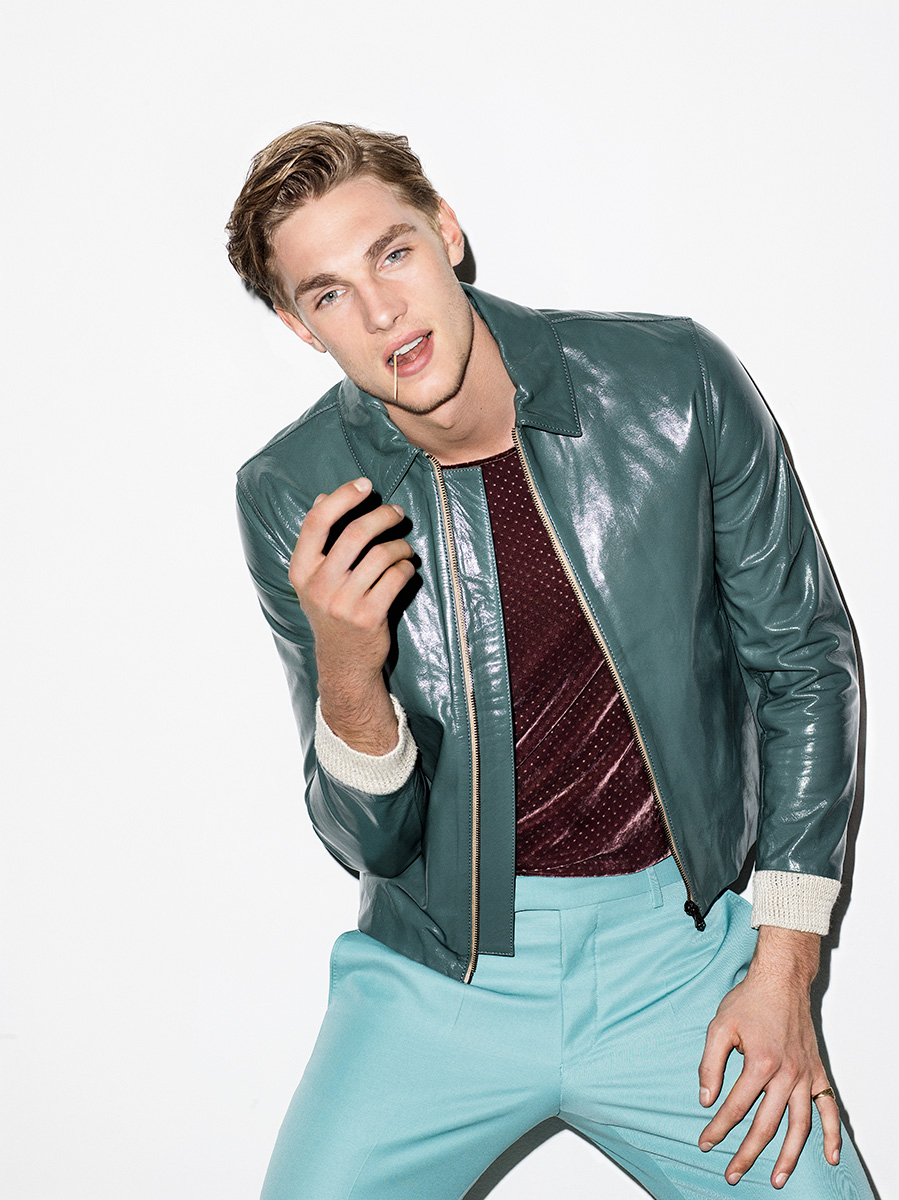 Tommy Marr embraces a pop of color in a leather jacket from Acne Studios.Pin