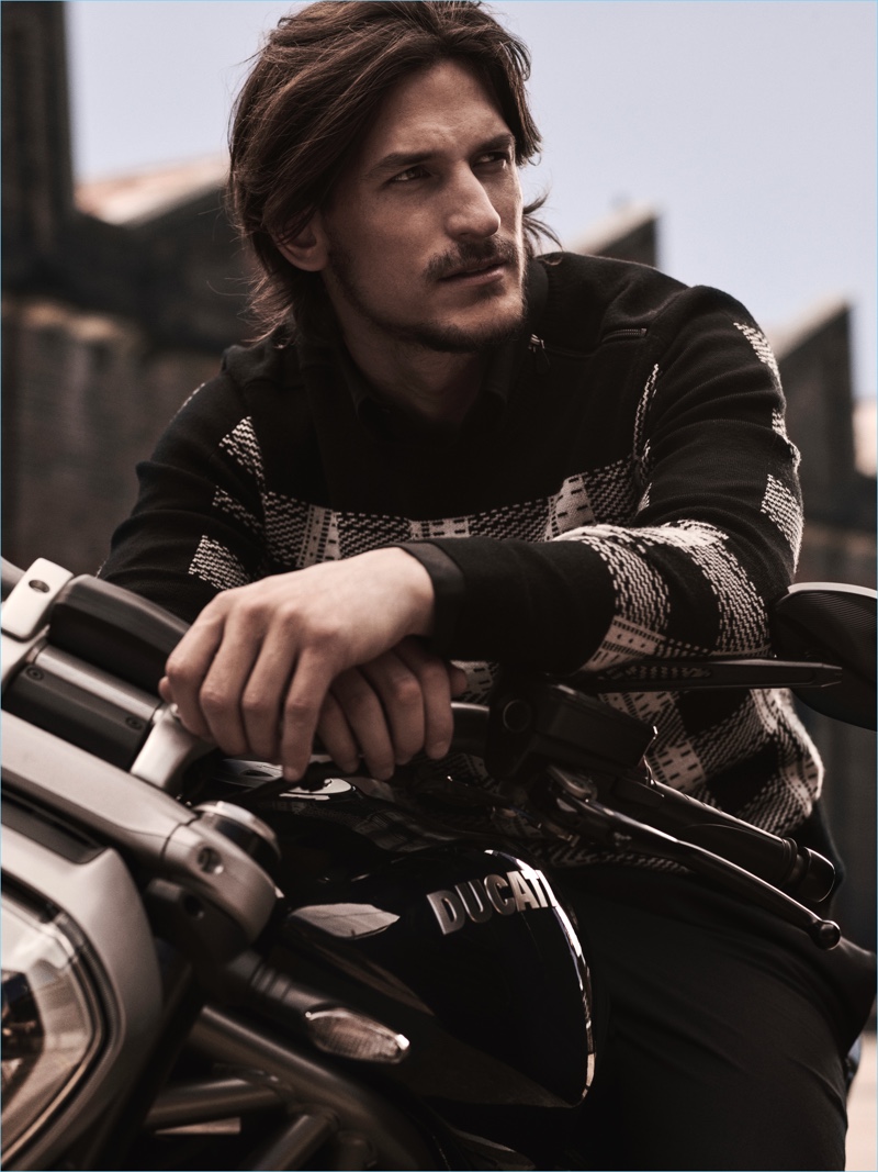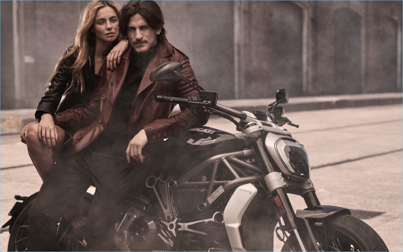 Relaxing on a motorcycle, Jarrod Scott and Bridget Malcolm star in Calibre’s fall-winter 2017 campaign.