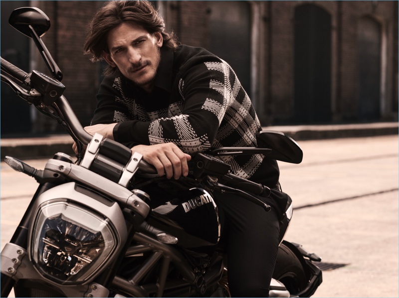 Relaxing on a motorcycle, Jarrod Scott and Bridget Malcolm star in Calibre's fall-winter 2017 campaign.Pin