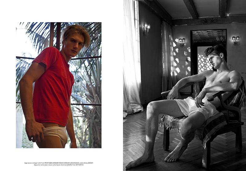 California Suite-Shooting an understated story for the spring/summer 2014 issue of SSAW magazine, photographer Paul Jasmin and stylist Trevor Stones come together in collaboration. Pulling together underwear and loungewear for a lazy California day, Stones outfits models Jamie Wise, Dallas Haupt, Lucky Blue and Erik Sage. / Hair by Sophie Roberts.