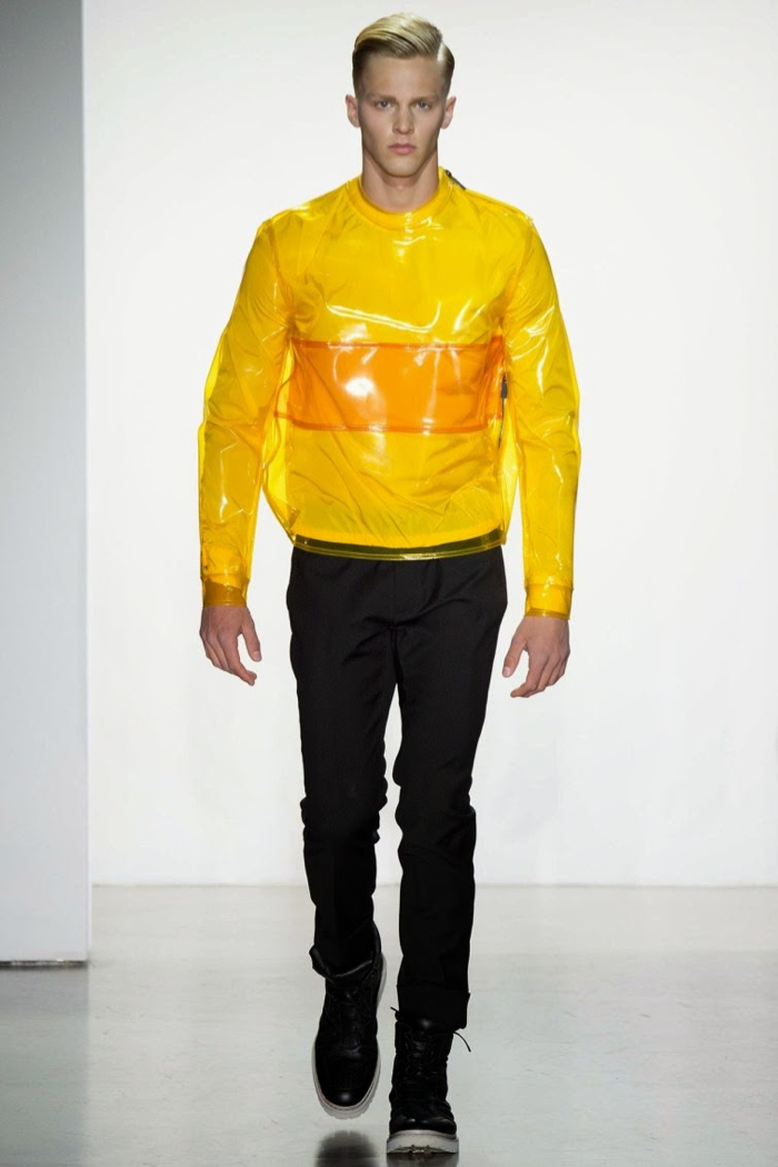 Calvin Klein Collection Spring/Summer 2015–Continuing in the vein of designing for the athletic man, Calvin Klein Collection men’s creative director Italo Zucchelli presented his spring/summer 2015 collection for the label. Embracing the mood of summer with the unexpected use of solar shades including vermilion red, solar yellow and tangerine, Zucchelli introduced PVC to his lineup. Monochromatic in nature, the collection created a clean mood with nude looks that consisted of tailored jackets, fitted tanks, shorts, t-shirts and other menswear essentials. The standout of the lineup if course were the solar numbers, which lifted the mood with its vibrant creative use of color and finish.