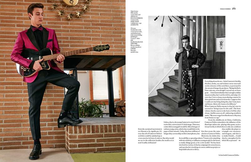 As fashion continues to chase the digital landscape that is increasingly driven by social media, viral sensation Cameron Dallas appears in the latest issue of Vogue Hommes Paris. The Viner turned model stars in a feature lensed by photographer Jack Pierson. Posing for cheeky images, Cameron is styled by Anastasia Barbieri. Embracing fashions with a campy all-American theme, Cameron is pictured in looks from Tom Ford, Dolce & Gabbana, Hermes and more.
