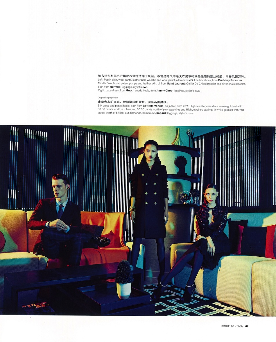 Glamour, After All–Decked out in a sleek and refined wardrobe, which includes pieces from the likes of Gucci, Hermès, Burberry Prorsum and others, Mannequin model Cameron Gordon is back on our pages with this new story featured in the July issue of ZbBz. Captured in a series of glamorous images, with the help of saturated colors and a modern architectural setting, Cameron is styled by Dolphin Yeo in sartorial double-breasted blazers, luxurious graphic sweaters and perfectly cut suits. / Styling assistance by Chua Chin. Hair by Junie Tan. Makeup by Keith Bryan Lee and Rina Sim.