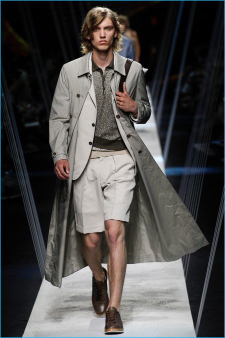 Here, textured jackets, pleated trousers, buttery soft leather jackets, suede shirt jackets, layered shorts, oversized trench coats and knit polo shirts conveyed the Canali man’s luxurious appeal. Balancing both relaxed and tailored silhouettes for the season, the collection was brought to a close with a light grey spin on the dinner jacket.