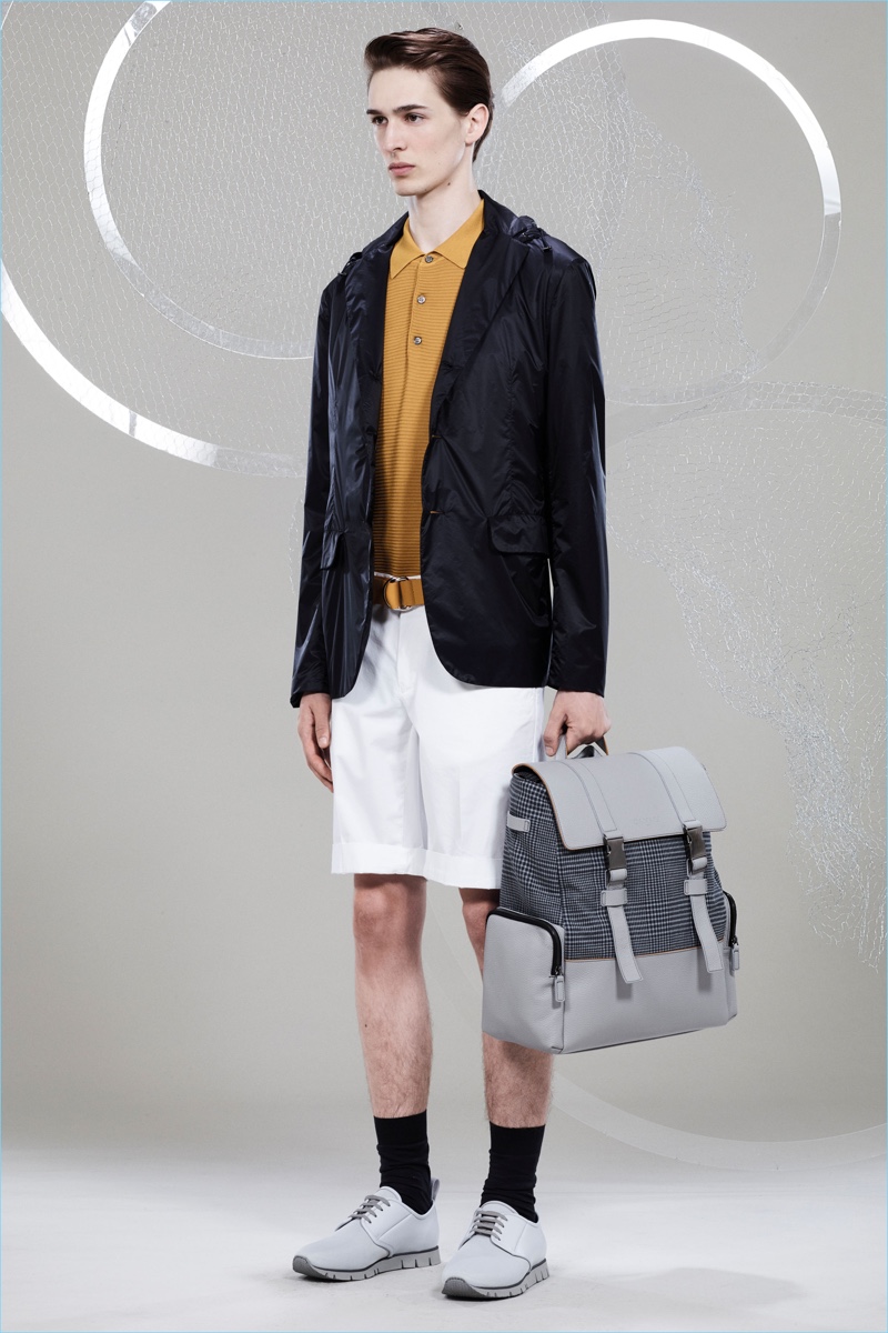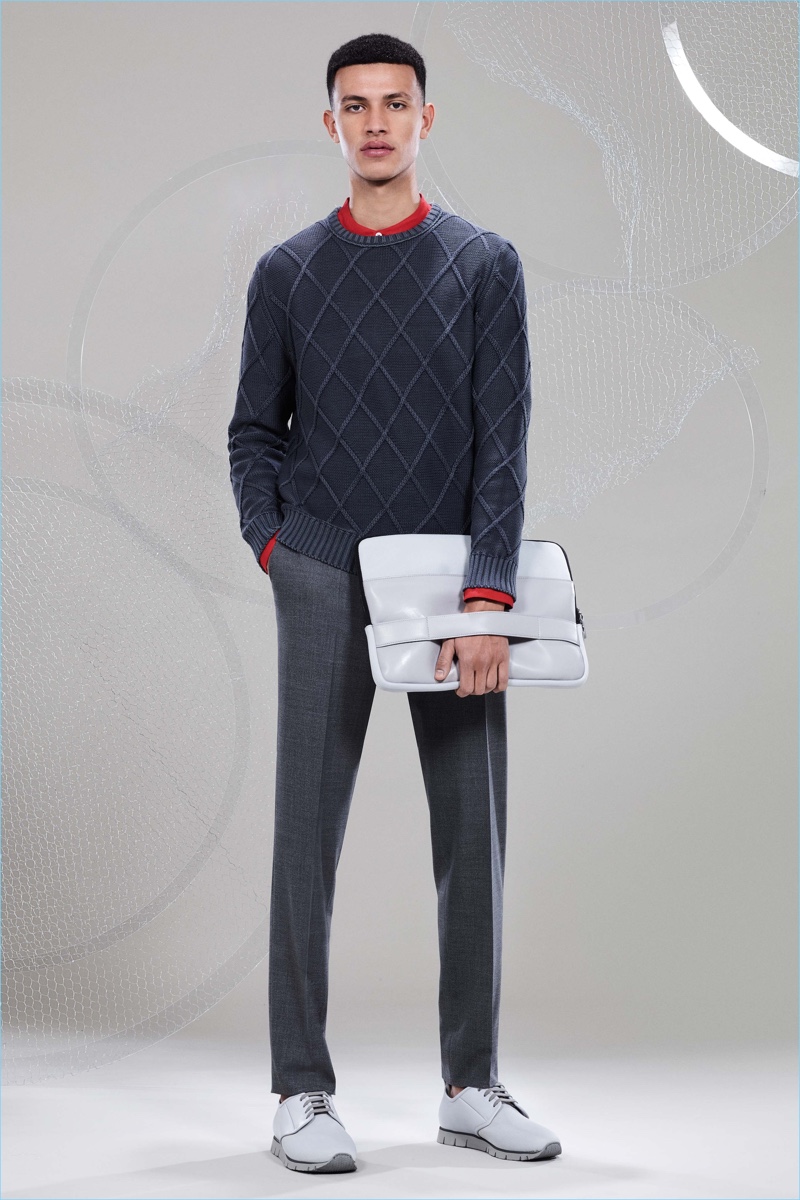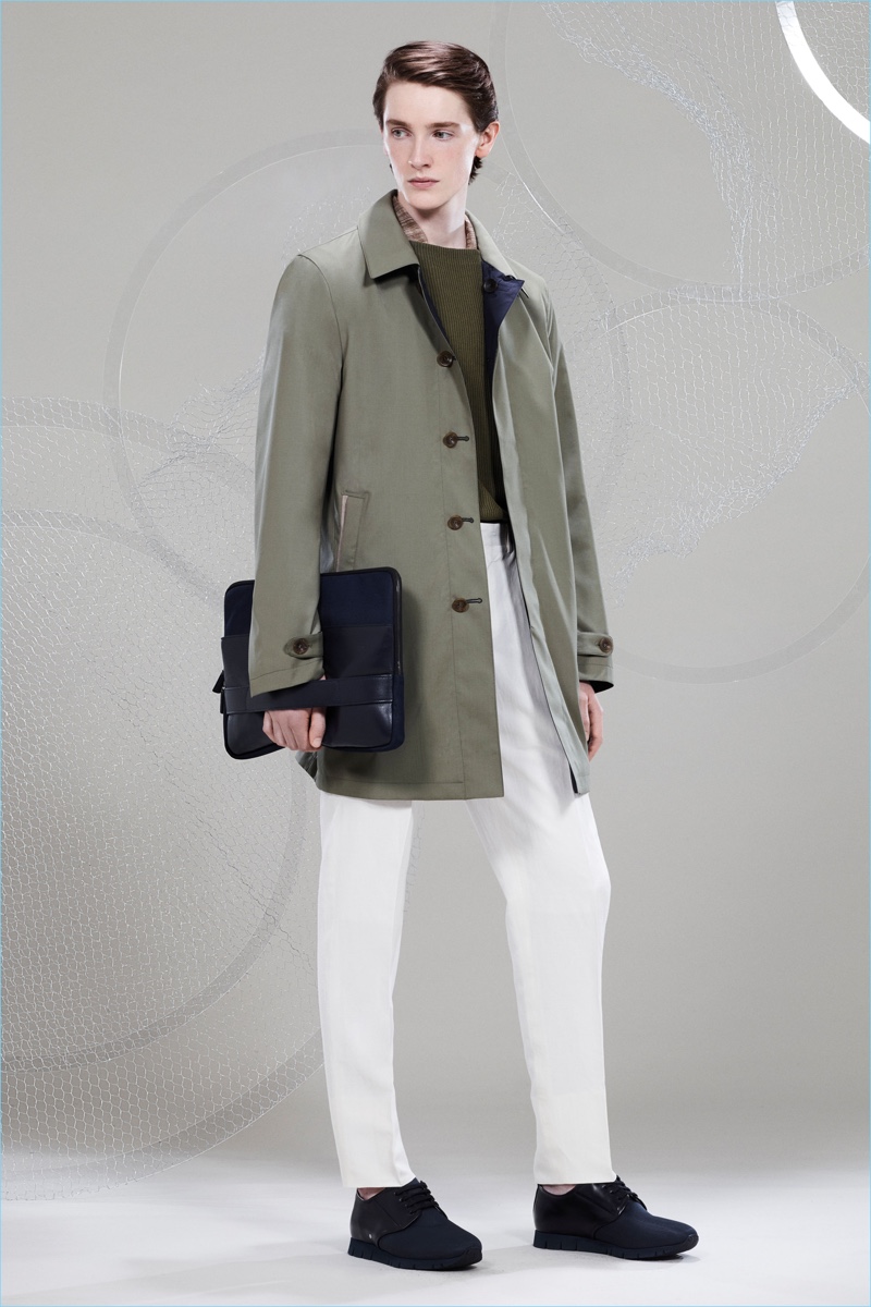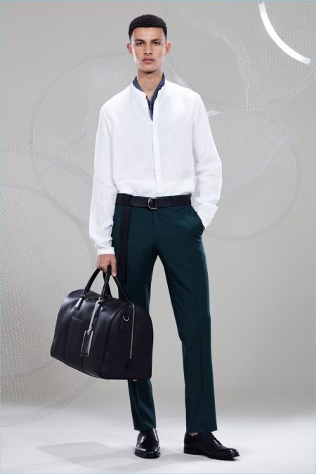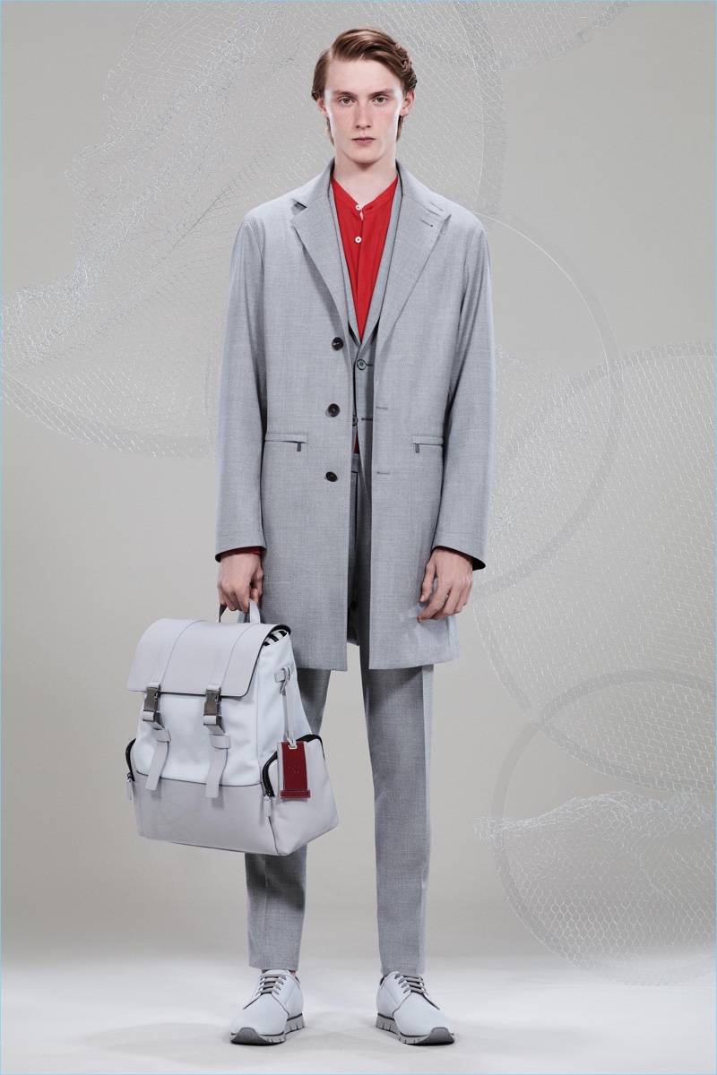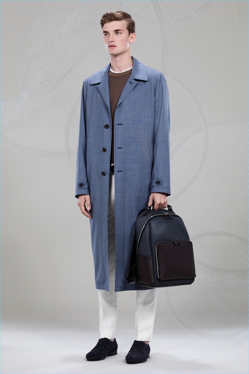 Canali keeps The Sophisticated Traveler in mind for spring-summer 2018. The Italian brand imagines its stylish man as traveling by train. Whether on the road for business or pleasure, Canali’s man adheres to smart style codes. Wearing narrow trousers, lean coats, light knitwear, and more, he is as comfortable as he is sleek. Canali also debuts its innovative fabric, Impeccabile 2.0. The miracle innovation is waterproof, breathable, and evens out creases with natural body heat.