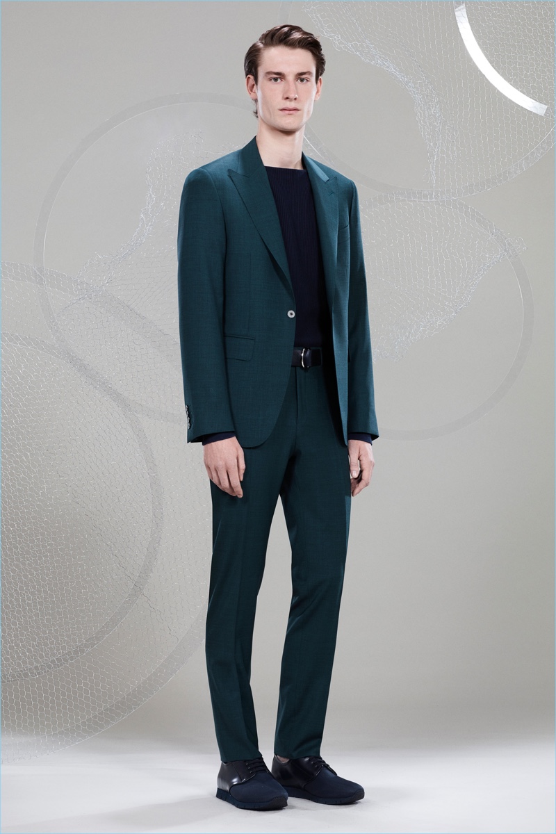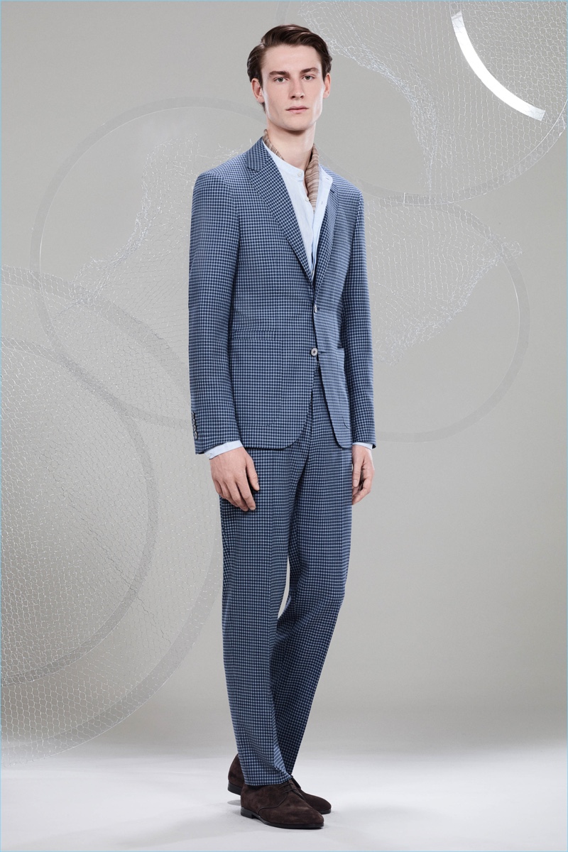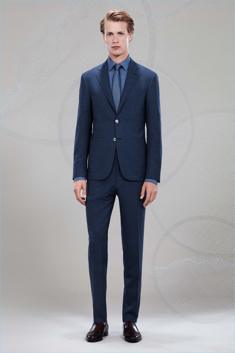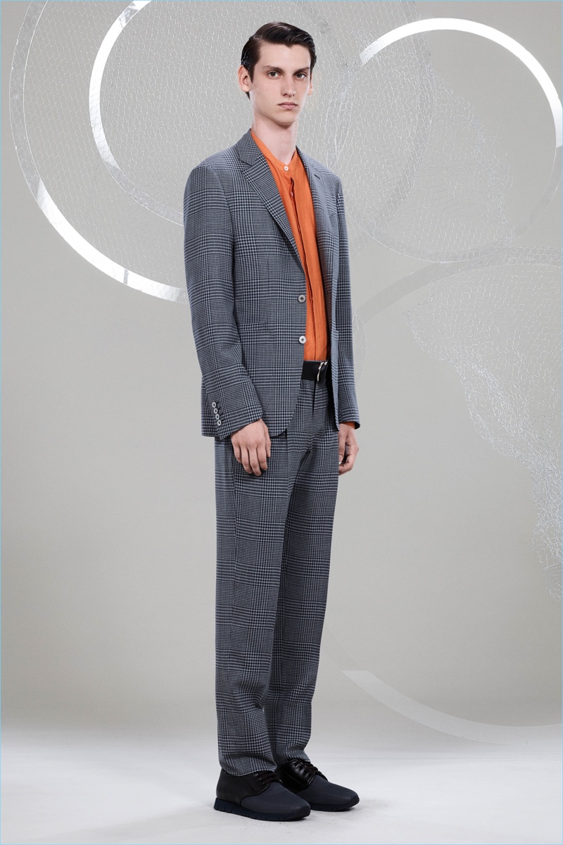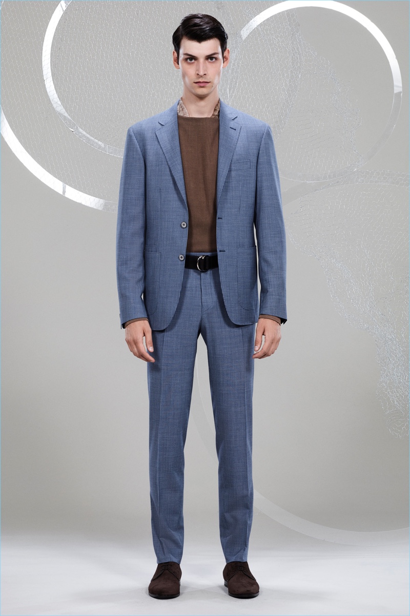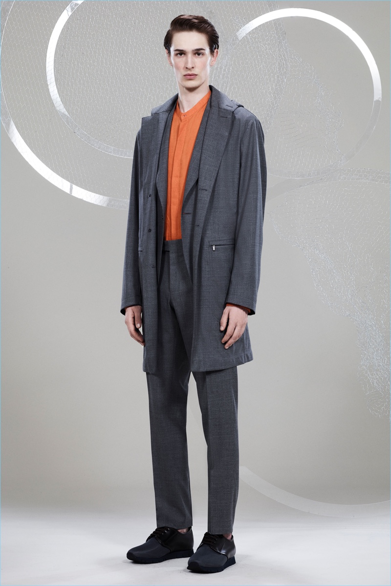 Canali keeps The Sophisticated Traveler in mind for spring-summer 2018. The Italian brand imagines its stylish man as traveling by train. Whether on the road for business or pleasure, Canali’s man adheres to smart style codes. Wearing narrow trousers, lean coats, light knitwear, and more, he is as comfortable as he is sleek. Canali also debuts its innovative fabric, Impeccabile 2.0. The miracle innovation is waterproof, breathable, and evens out creases with natural body heat.