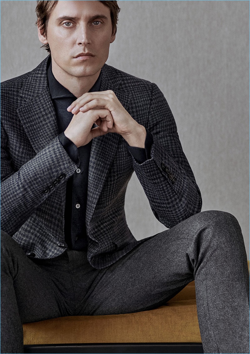First, the brand enlists models Sébastien Andrieu and Christopher Einla to star in its advertisement. The pair dons trim suits and luxurious sportswear. They also appear in this season’s catalog. Chris Doe and Corey Baptiste are present as well. Together, the models showcase Canali’s strong selection of jackets, knitwear, coats, and suits.