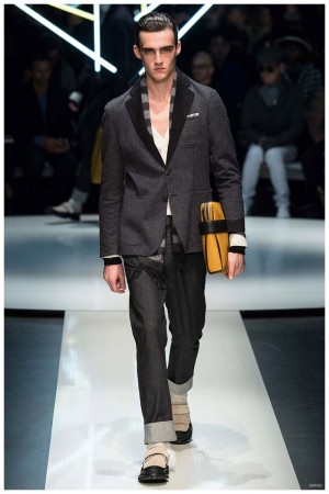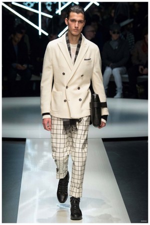 Borrowing a stylish page from the 1950s, Canali creative director Andrea Pompilio delivered a straight-forward menswear outing with sartorial suiting, outerwear and everything in-between. Dressed in stripes and checks, double-breasted suits were met with impeccably tailored coats. Adding a casual flair, smart fitted shirts and cable-knit sweaters made an impression along with tailored denim jeans.