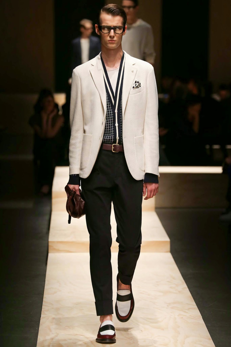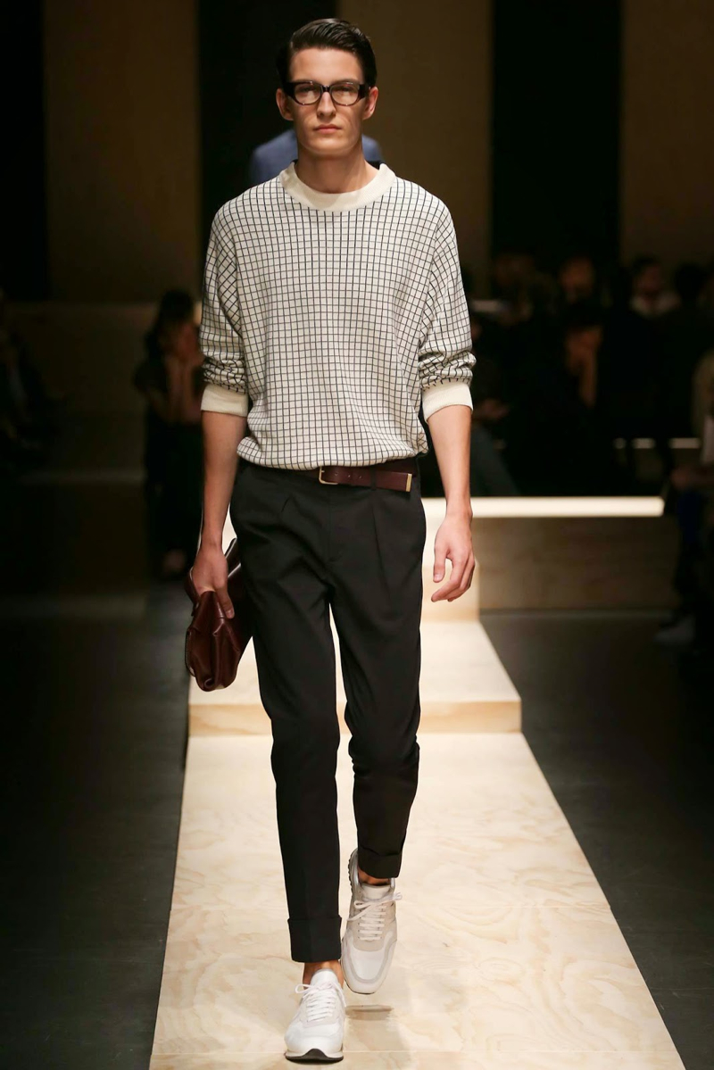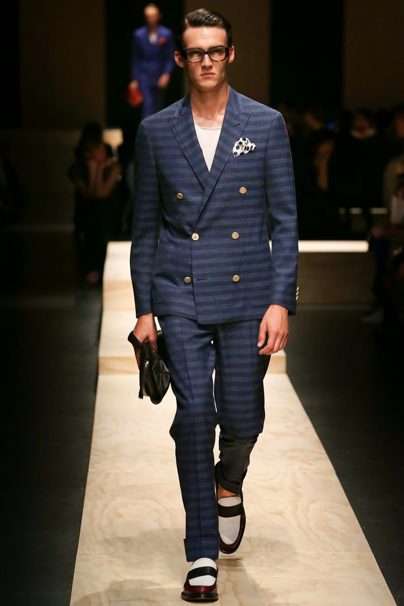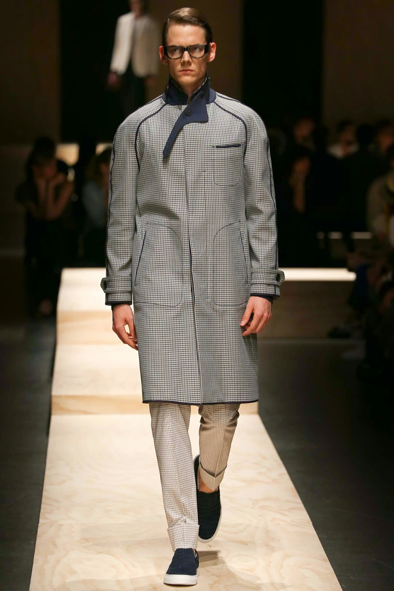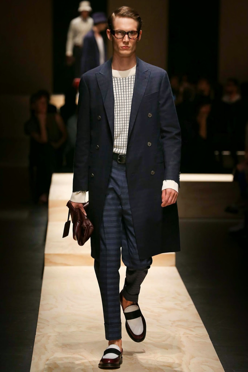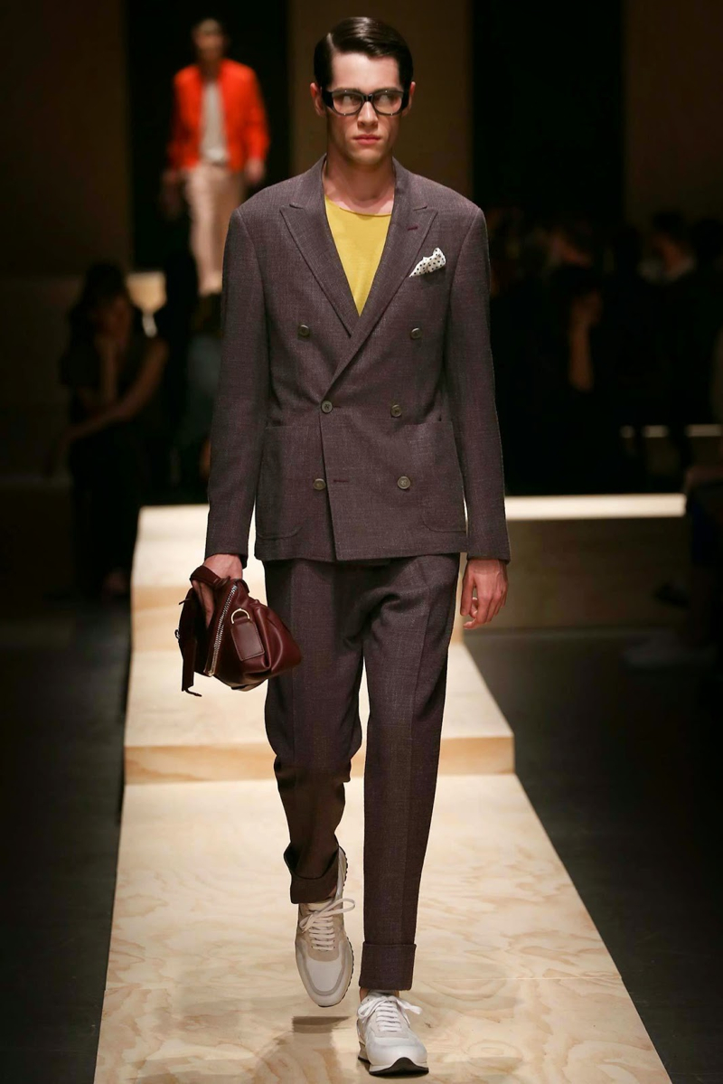 Canali Spring/Summer 2015–When it comes to style, the Canali man is serious. Unveiling his debut outing for the label, creative consultant Andrea Pompilio kept the lines trim and the wardrobe tight as models with slicked back hair and optical frames hit the narrow catwalk. Tonal stripes and grid patterns dressed knitwear and trousers as the Canali man opened up his wardrobe, which consisted of smart separates. Interjecting colors, ranging from red and blue to yellow, all the main colors were represented as precise cut tops, printed shorts and more came together, still with room for an evening tuxe.