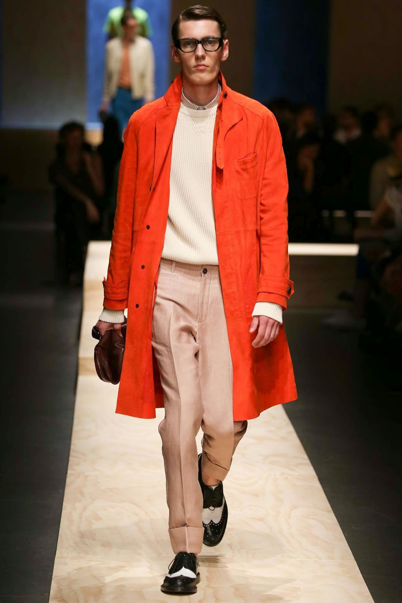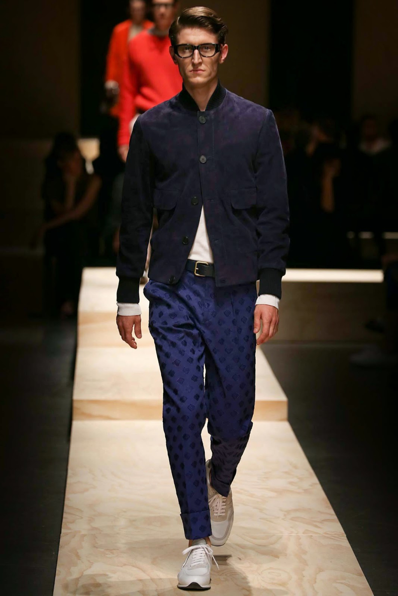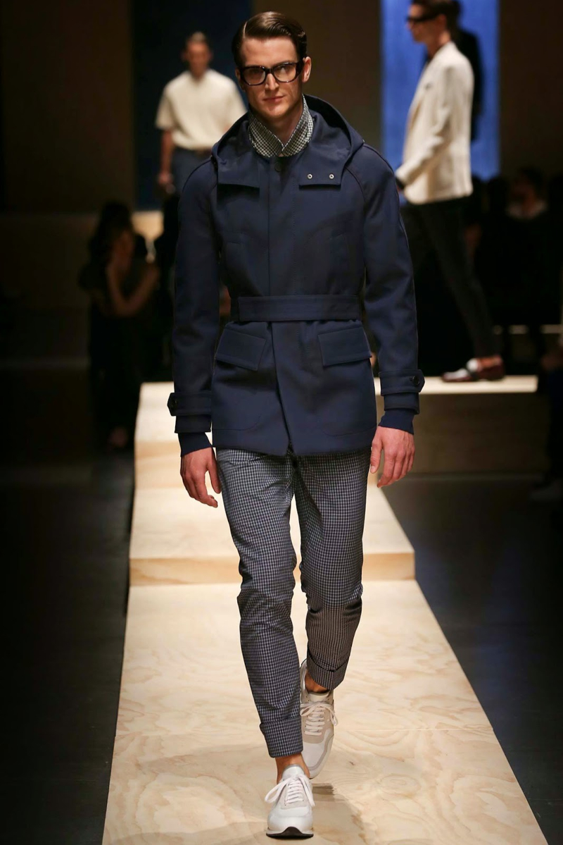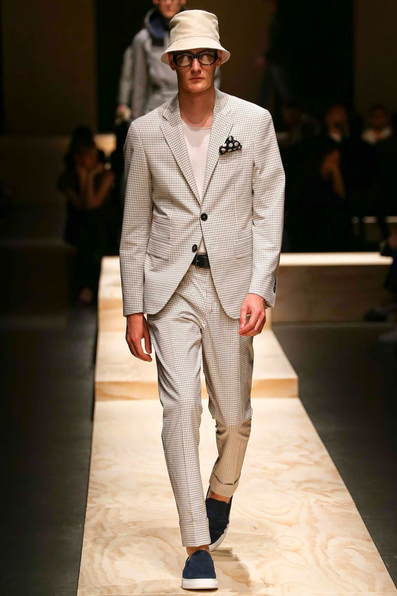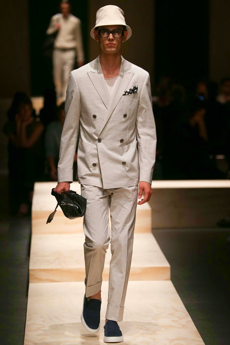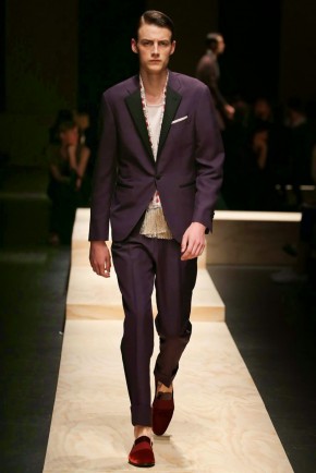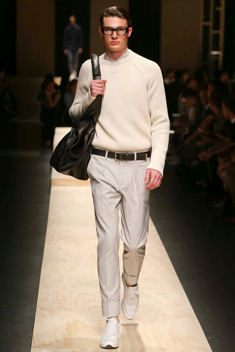 Canali Spring/Summer 2015–When it comes to style, the Canali man is serious. Unveiling his debut outing for the label, creative consultant Andrea Pompilio kept the lines trim and the wardrobe tight as models with slicked back hair and optical frames hit the narrow catwalk. Tonal stripes and grid patterns dressed knitwear and trousers as the Canali man opened up his wardrobe, which consisted of smart separates. Interjecting colors, ranging from red and blue to yellow, all the main colors were represented as precise cut tops, printed shorts and more came together, still with room for an evening tuxe.