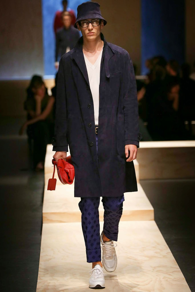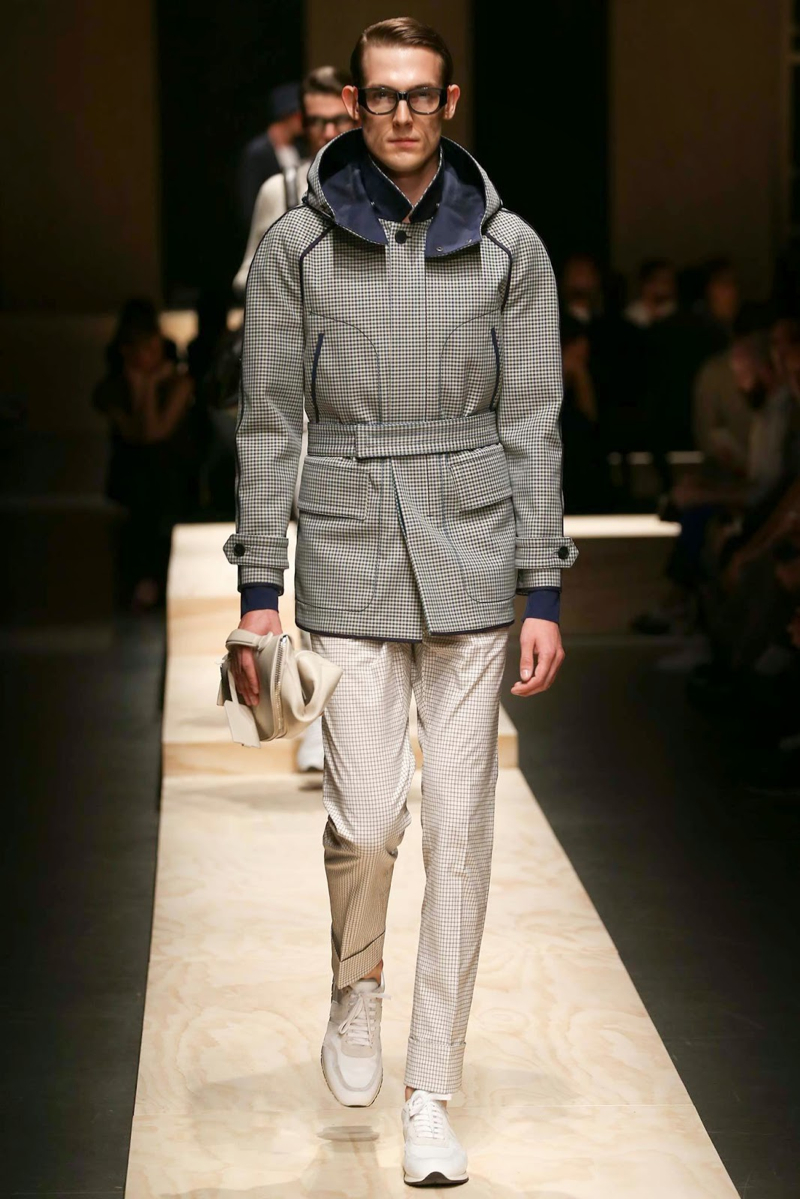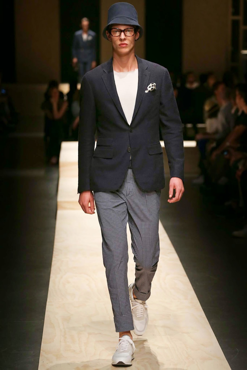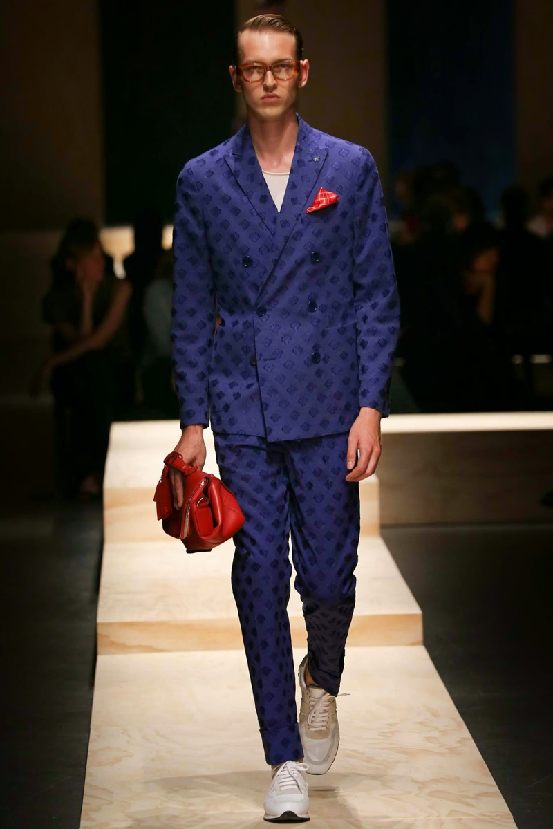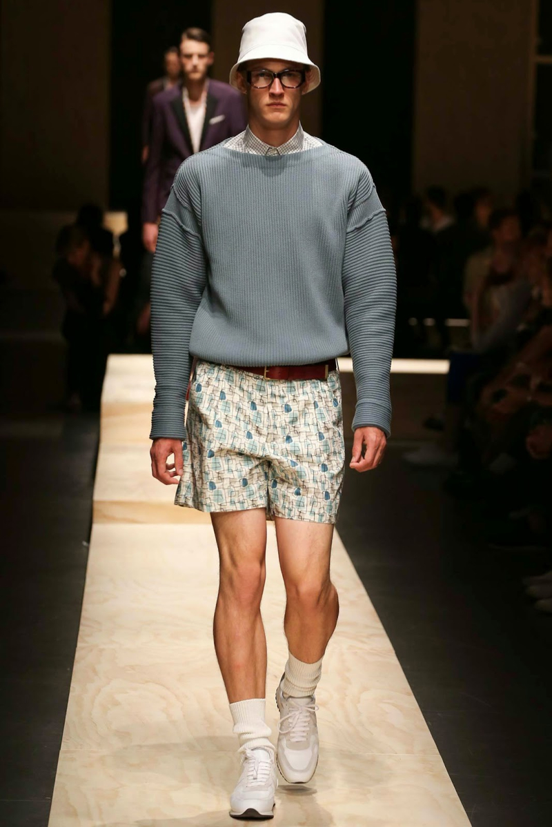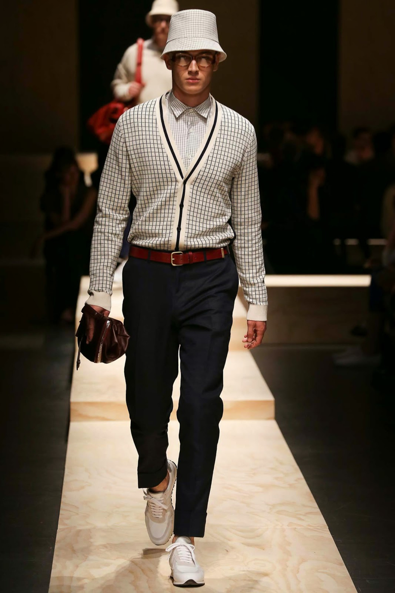 Canali Spring/Summer 2015–When it comes to style, the Canali man is serious. Unveiling his debut outing for the label, creative consultant Andrea Pompilio kept the lines trim and the wardrobe tight as models with slicked back hair and optical frames hit the narrow catwalk. Tonal stripes and grid patterns dressed knitwear and trousers as the Canali man opened up his wardrobe, which consisted of smart separates. Interjecting colors, ranging from red and blue to yellow, all the main colors were represented as precise cut tops, printed shorts and more came together, still with room for an evening tuxe.