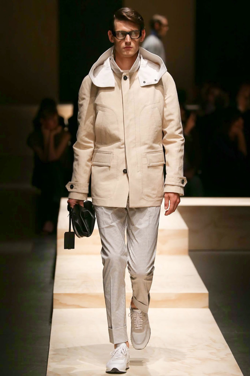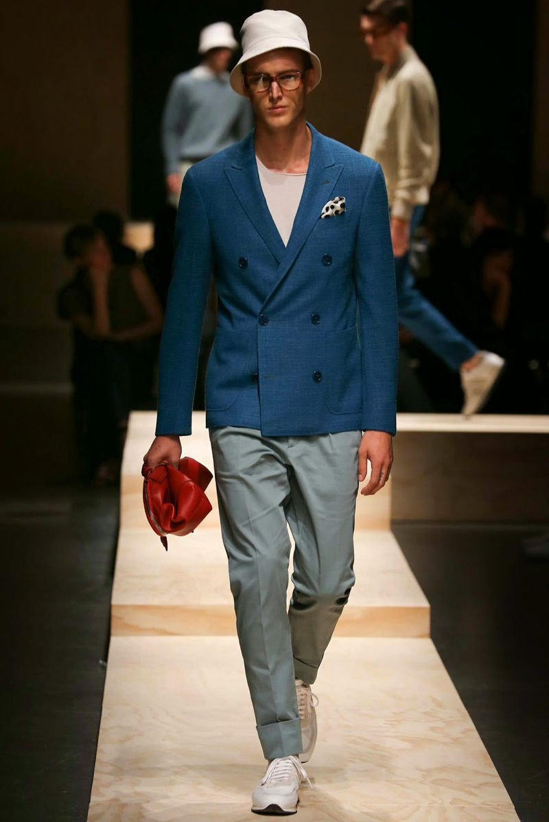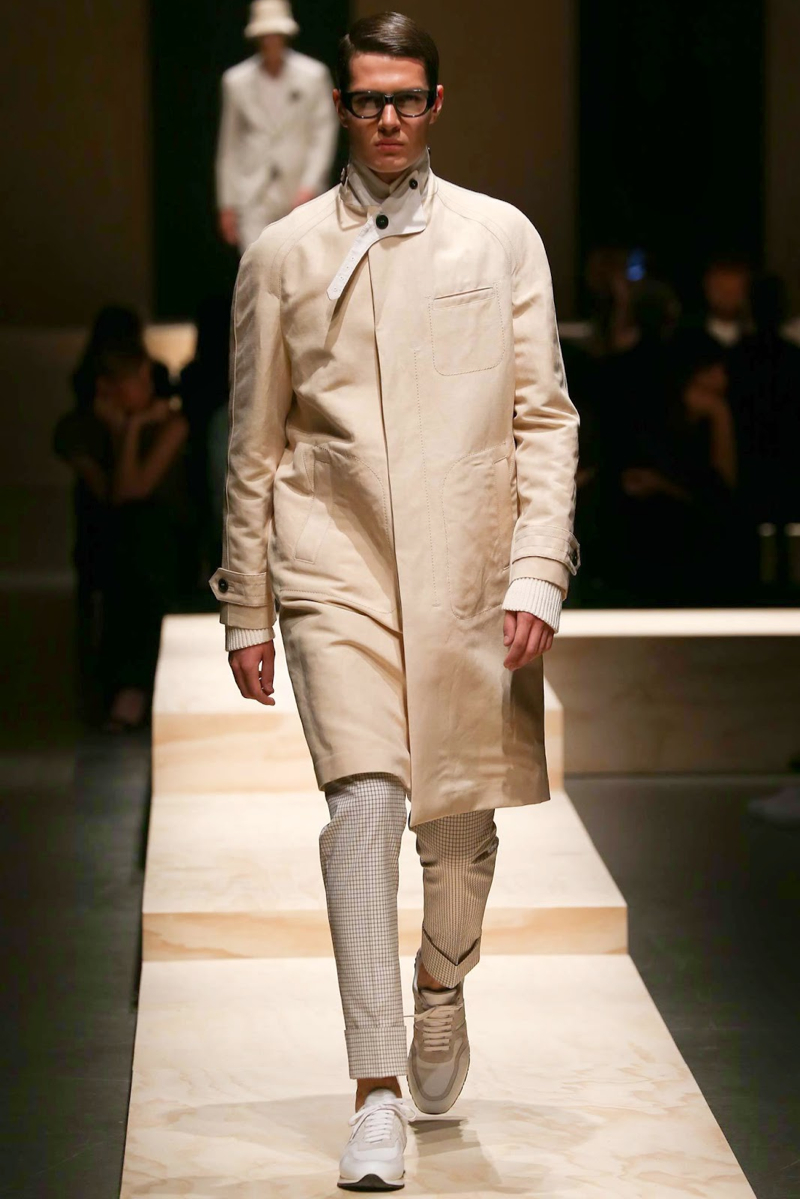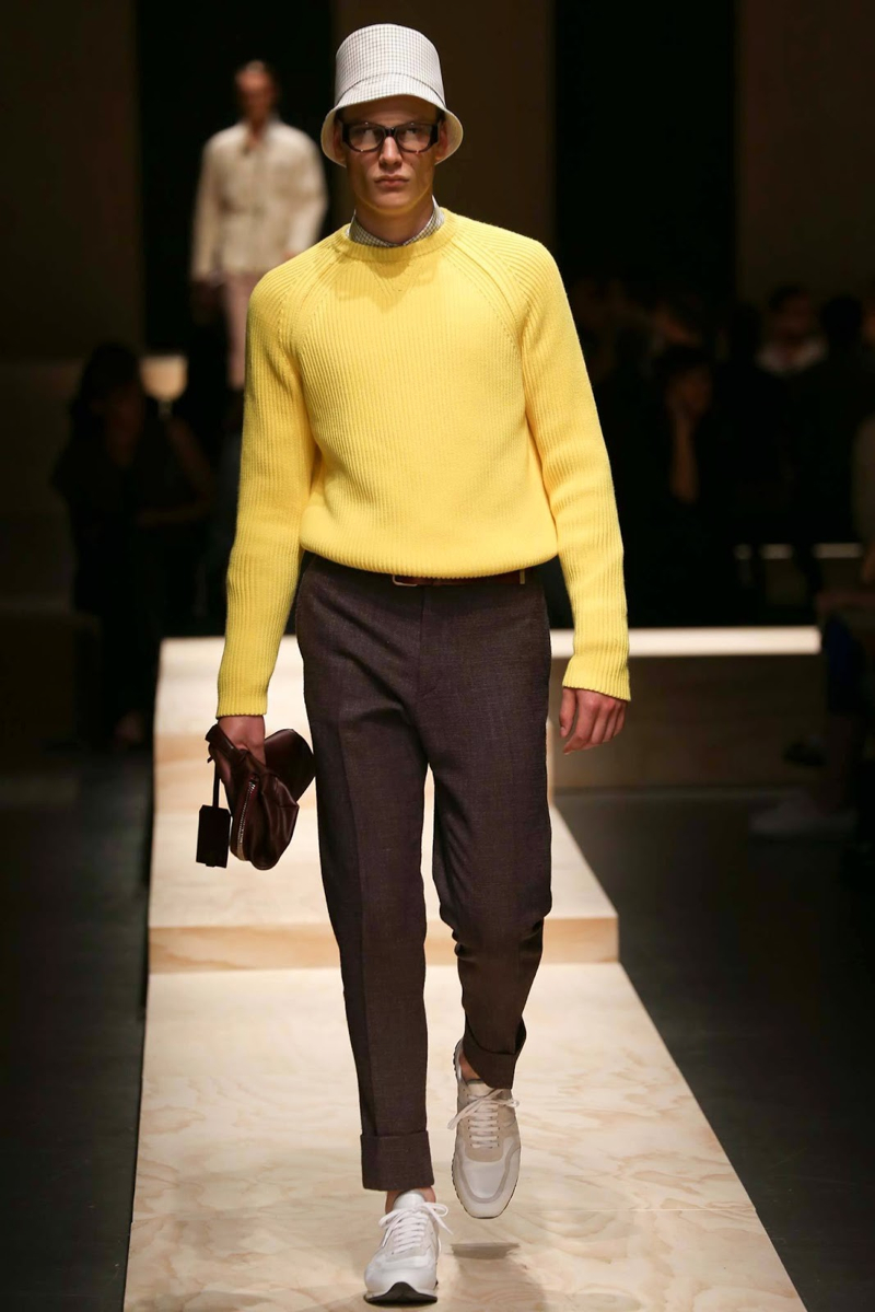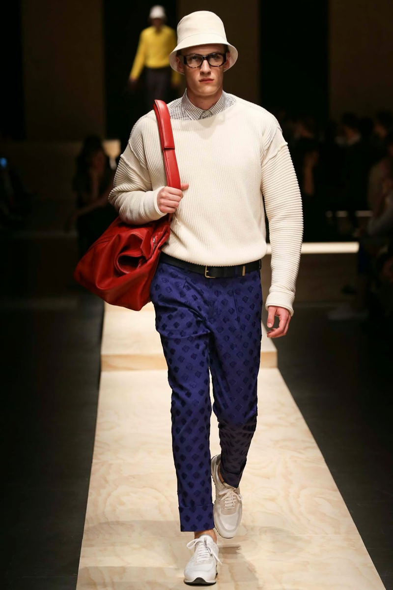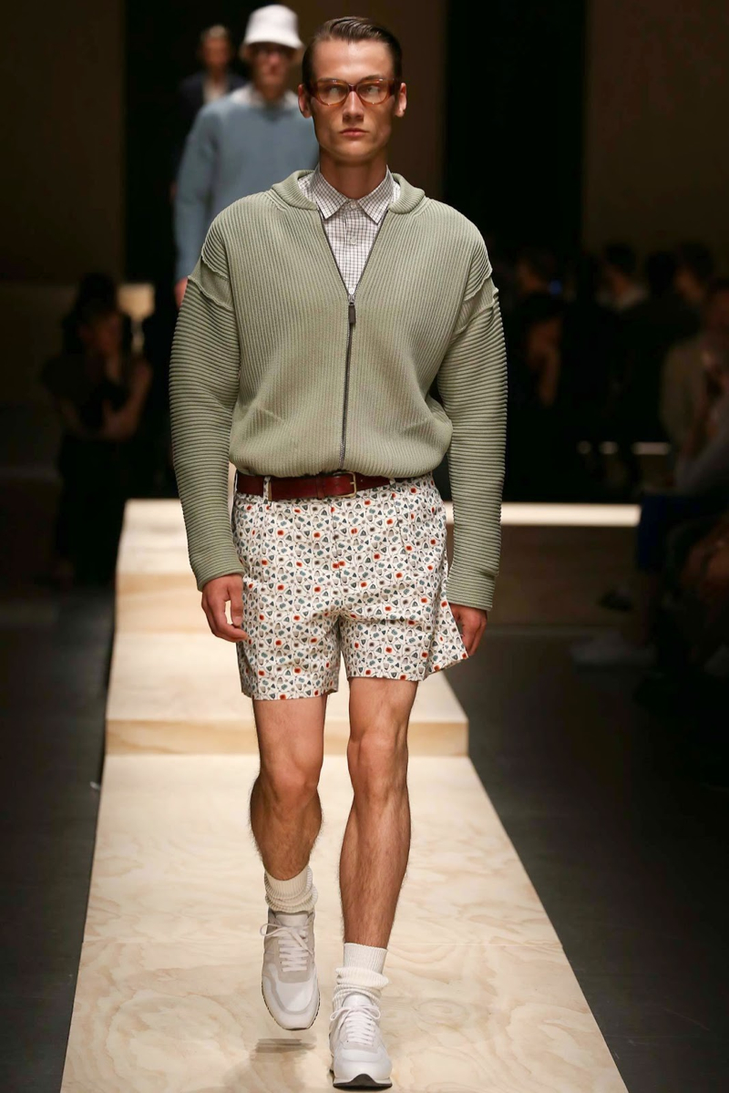 Canali Spring/Summer 2015–When it comes to style, the Canali man is serious. Unveiling his debut outing for the label, creative consultant Andrea Pompilio kept the lines trim and the wardrobe tight as models with slicked back hair and optical frames hit the narrow catwalk. Tonal stripes and grid patterns dressed knitwear and trousers as the Canali man opened up his wardrobe, which consisted of smart separates. Interjecting colors, ranging from red and blue to yellow, all the main colors were represented as precise cut tops, printed shorts and more came together, still with room for an evening tuxe.