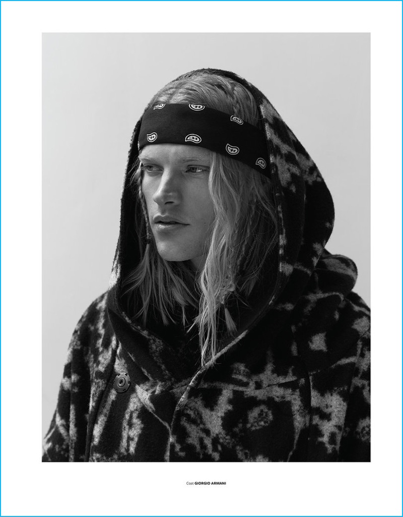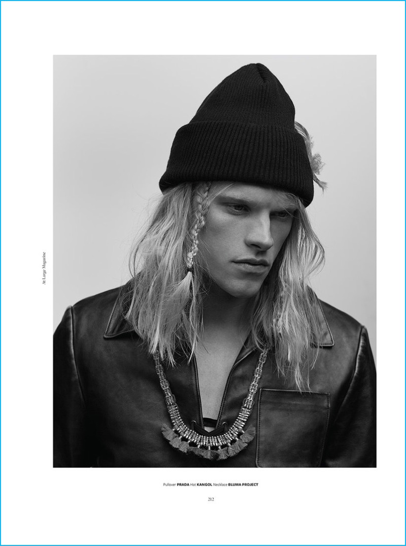 Stylist Julie Ragolia has fun with accessories and fall fashions with a new editorial from At Large magazine. The story tackles a tribal style narrative with photography by Chad Davis. Model Carlton Ruth leads the photo shoot as the protagonist. Outfitted by Ragolia, Carlton wears statement pieces that range from a graphic Giorgio Armani coat to a Rick Owens jumpsuit. Carlton also provides hair inspiration with a mix of tousled locks and braids.
