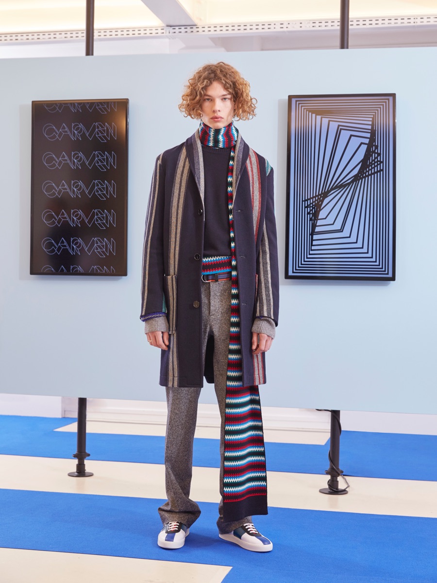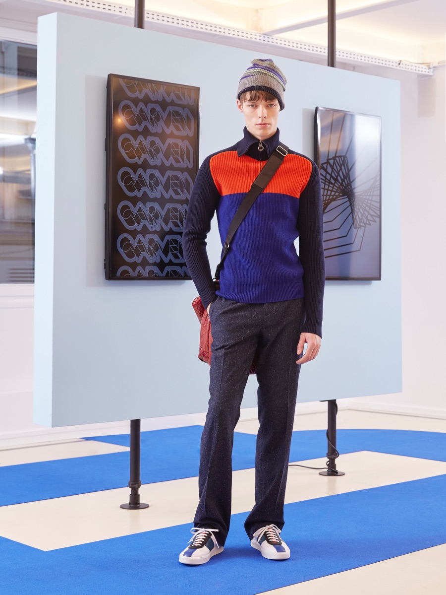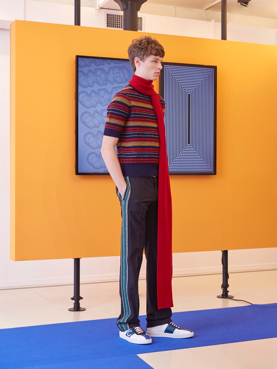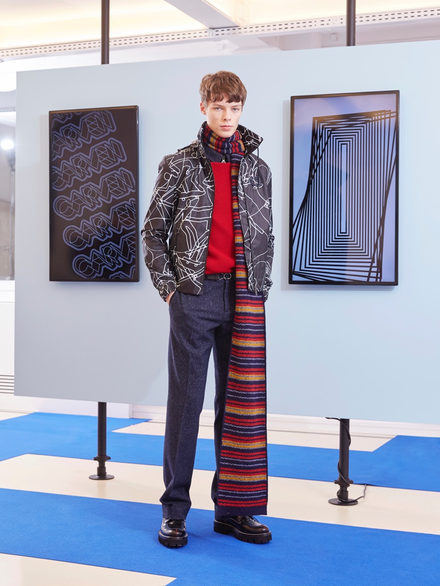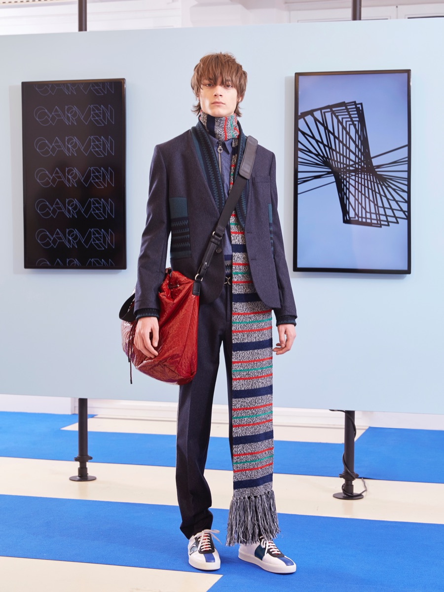 Carven creative director Barnabé Hardy makes a playful style proposal with his fall-winter 2016 men’s collection. Referencing fashions of the late 1970s and early 80s, Hardy embraces relaxed silhouettes and a mix of textiles that include corduroy, nylon and terry. Seeped with charm, the range catches the eye with its signature use of long striped scarves. The standout accessory complements a season of knit sweaters that entice with colorblocking and stripes.