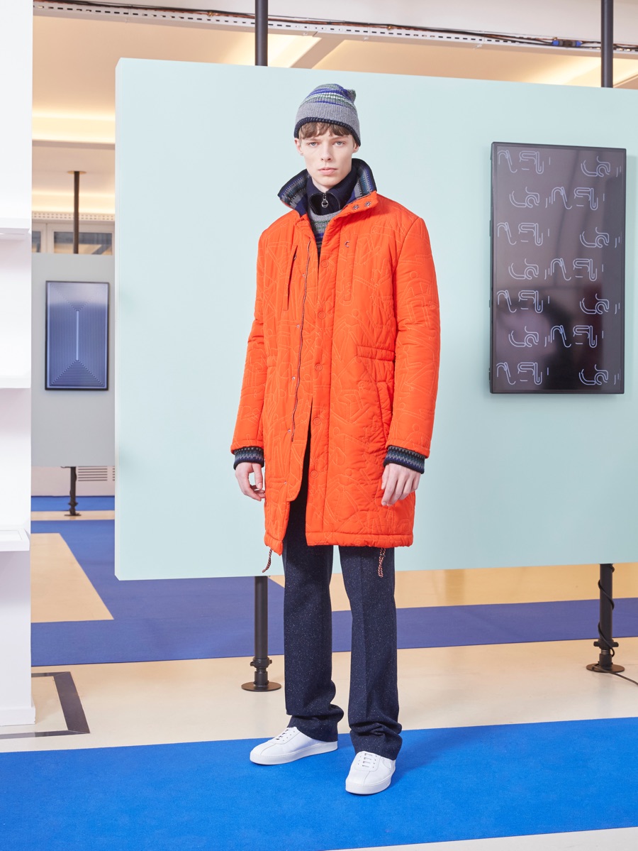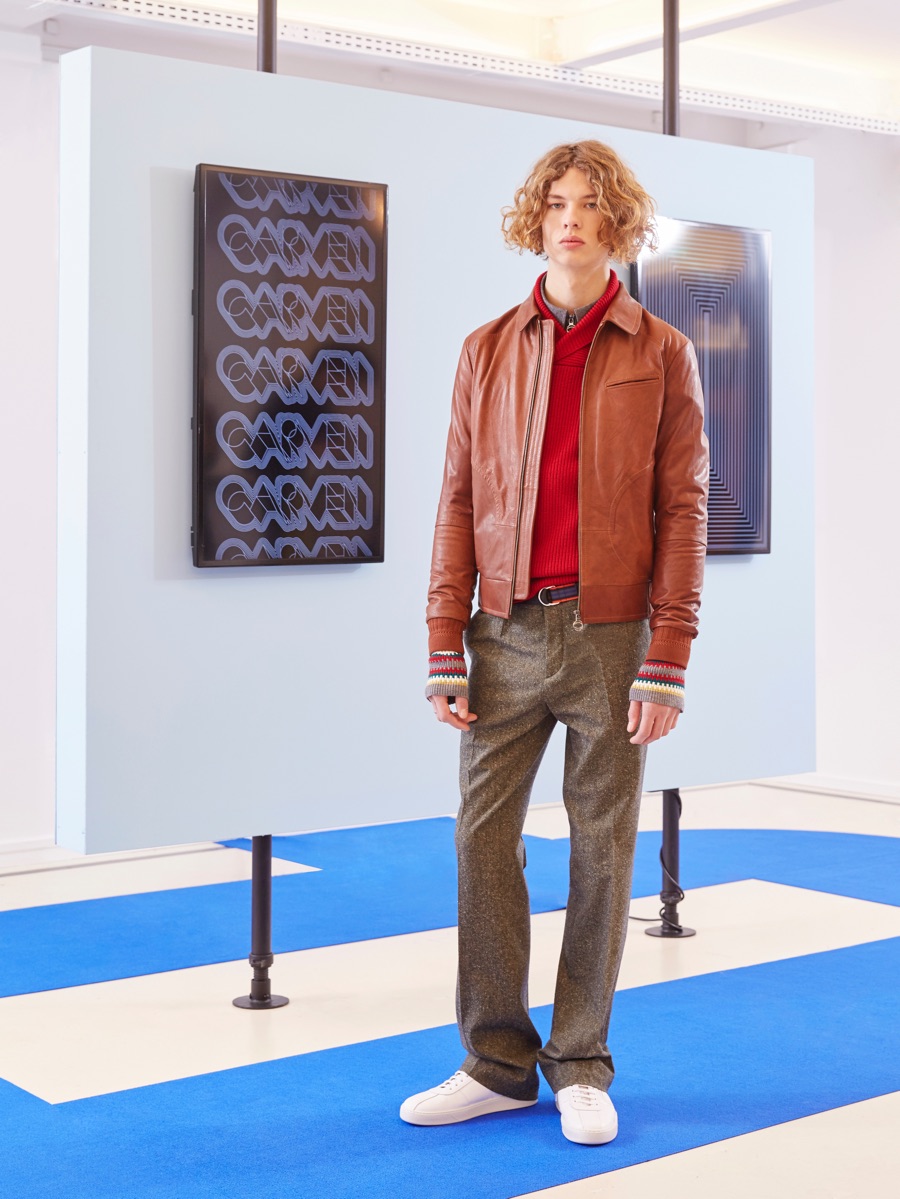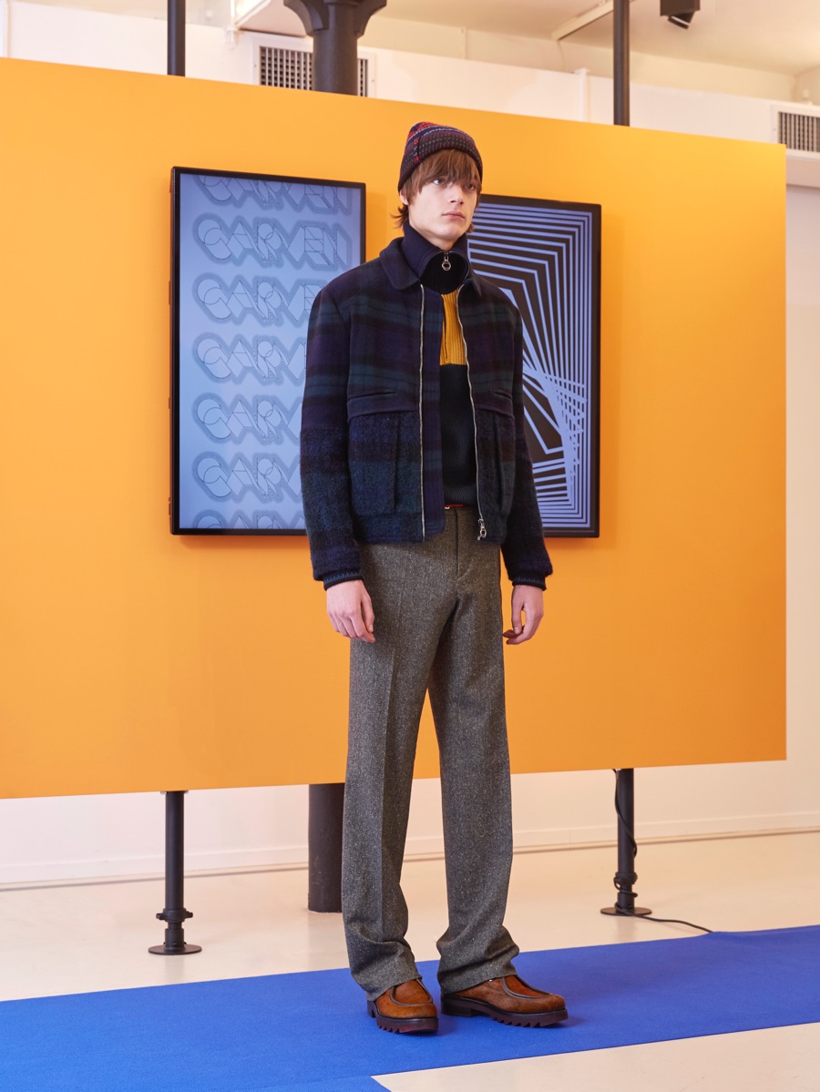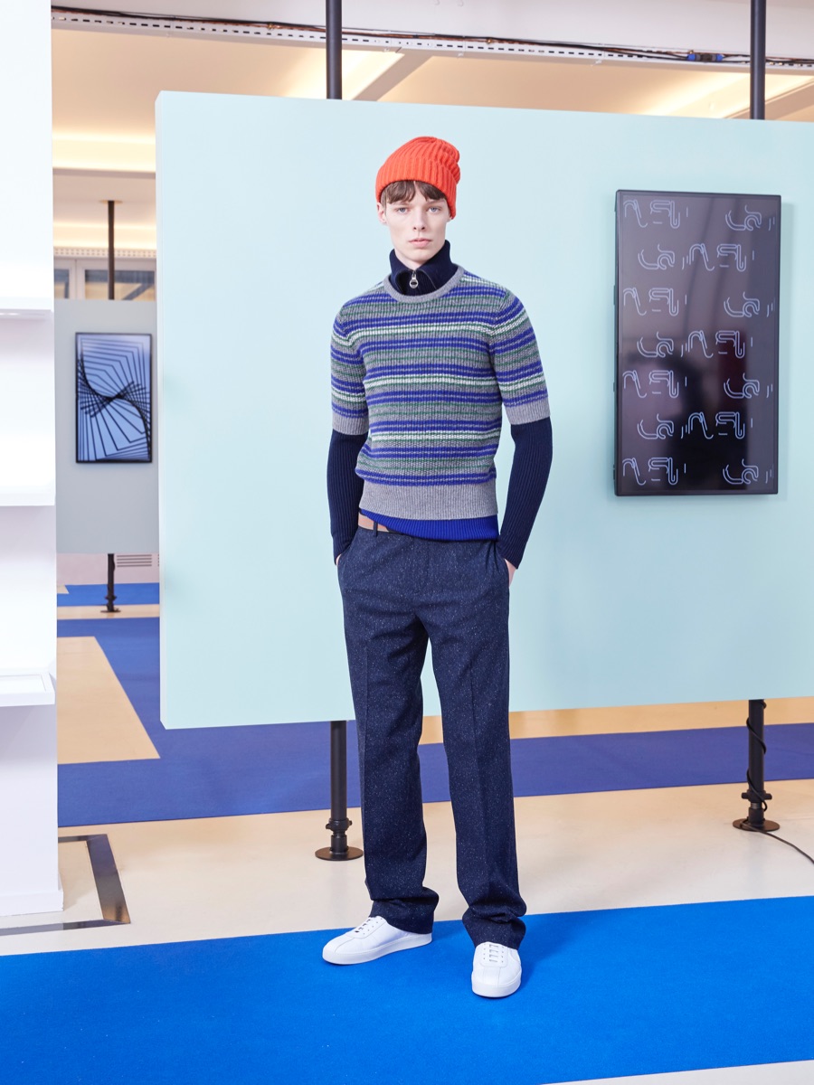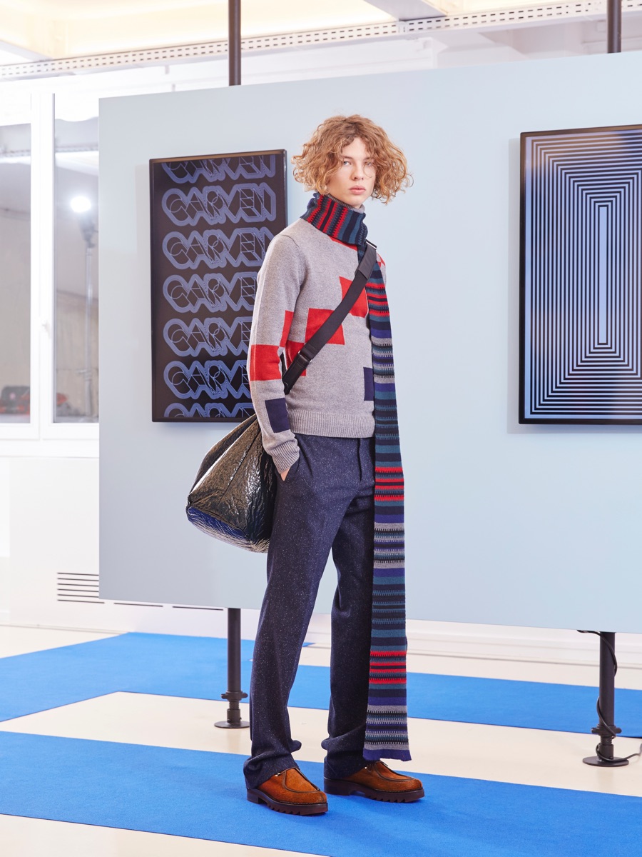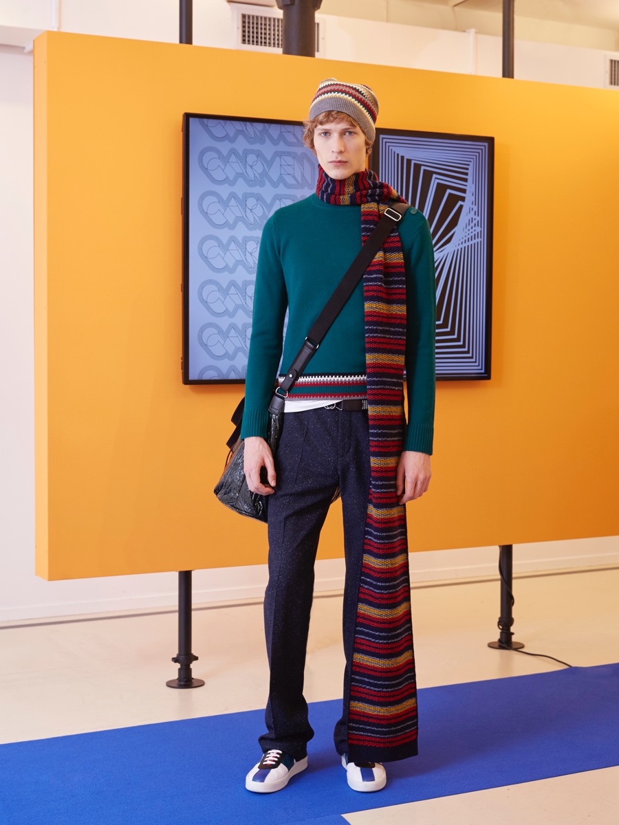 Carven creative director Barnabé Hardy makes a playful style proposal with his fall-winter 2016 men’s collection. Referencing fashions of the late 1970s and early 80s, Hardy embraces relaxed silhouettes and a mix of textiles that include corduroy, nylon and terry. Seeped with charm, the range catches the eye with its signature use of long striped scarves. The standout accessory complements a season of knit sweaters that entice with colorblocking and stripes.