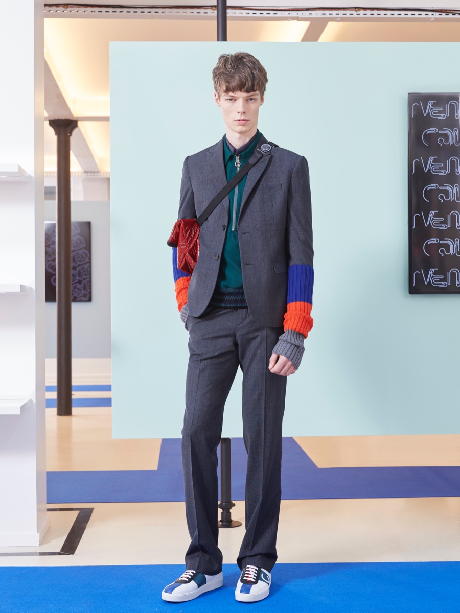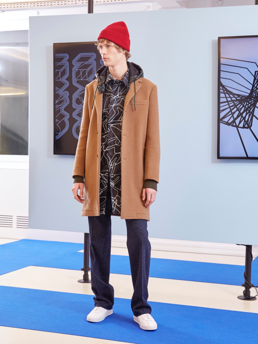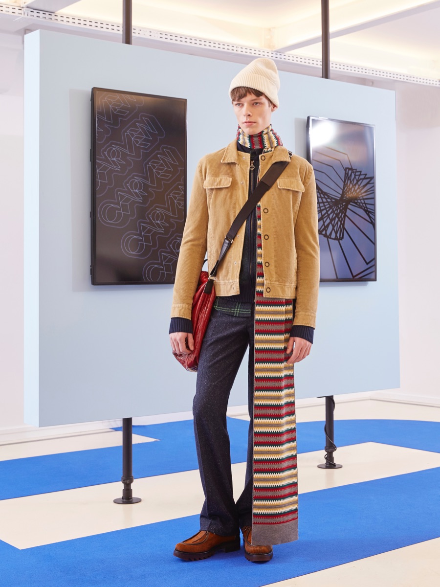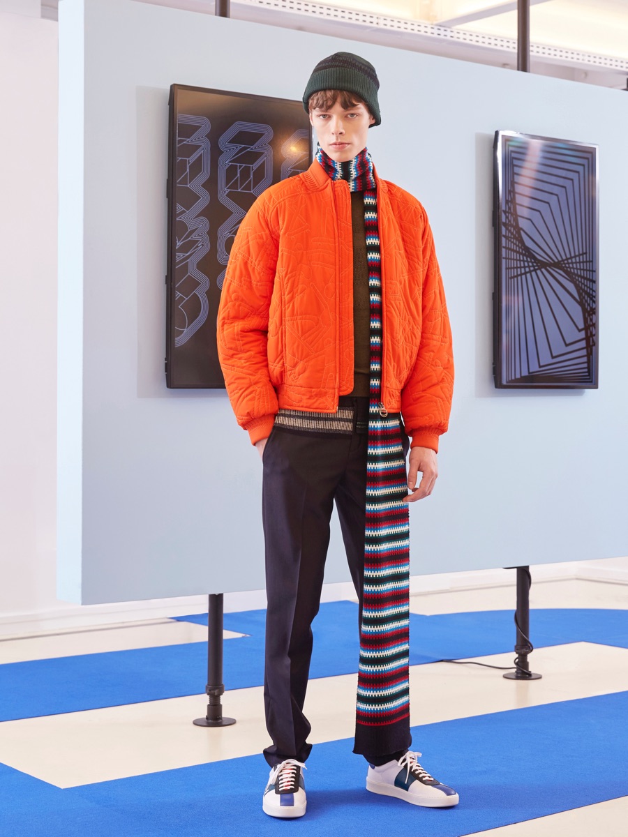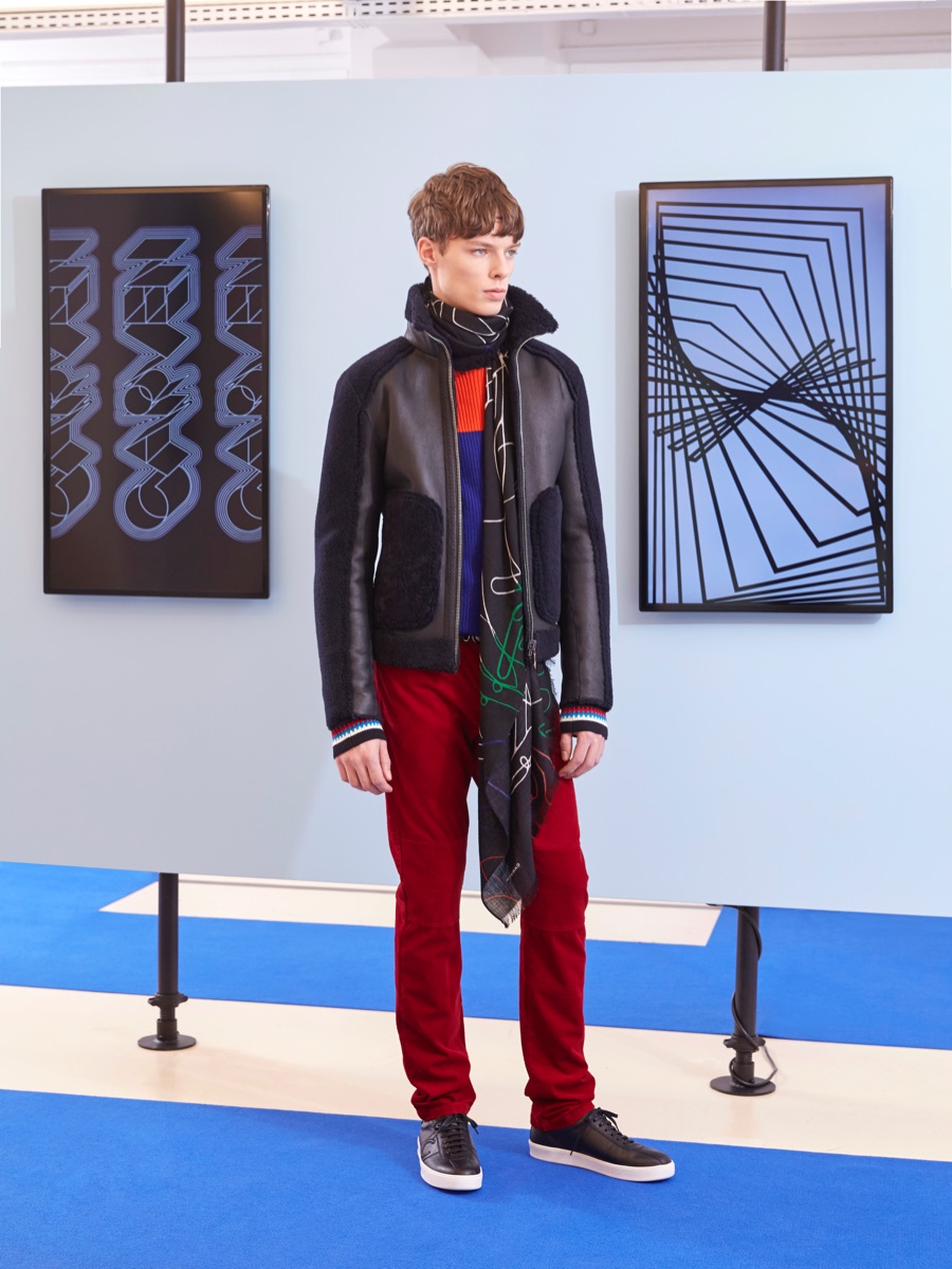 Carven creative director Barnabé Hardy makes a playful style proposal with his fall-winter 2016 men’s collection. Referencing fashions of the late 1970s and early 80s, Hardy embraces relaxed silhouettes and a mix of textiles that include corduroy, nylon and terry. Seeped with charm, the range catches the eye with its signature use of long striped scarves. The standout accessory complements a season of knit sweaters that entice with colorblocking and stripes.