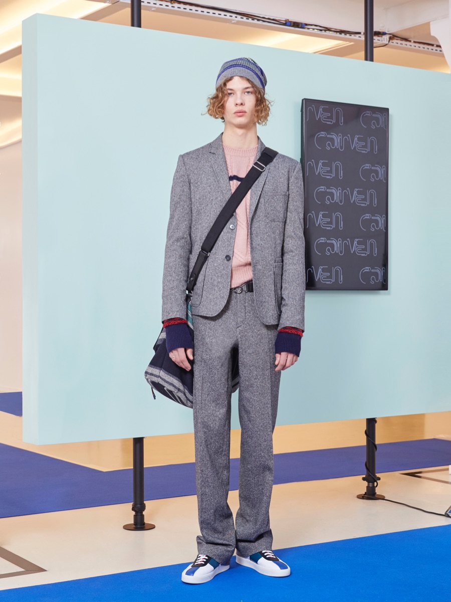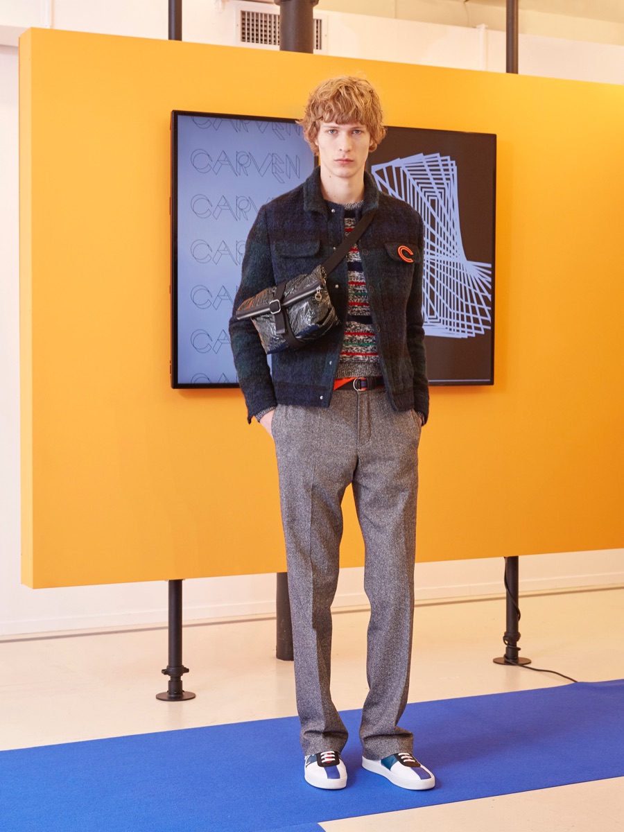 Meanwhile, slim-cut trousers are let out for a looser fit and paired with Carven’s hybrid sports shoe. In addition to its colorful options, Carven’s shoes tap into the shearling trend, making for quite the dapper style statement. Inspired by pop art, the collection is rounded out with character-infused sweatshirts, knits and shirts. Touching upon a cool color palette of grey, khaki and navy, winter hues are contrasted against pops of blood orange, ruby red and fluorescent green.