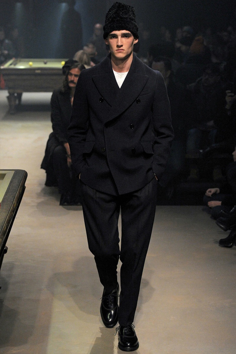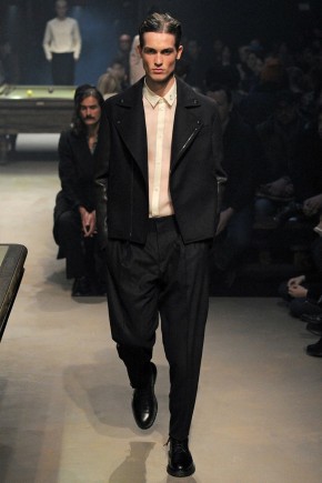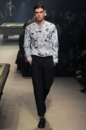 Carven Fall/Winter 2014–While Dsquared2 unveiled a collection yesterday in Milan, inspired by the contemporary prison system, Carven creative director Guillaume Henry took to the Parisian stage today with a nod to the past. Inspired by prison mug shots of the early 1900s, Henry turned out a collection, darker than usual. Here, semi-relaxed silhouettes took shape with wool coats, pleated trousers and collarless dress shirts. Capturing the theme of the season, prints inspired by prison graffiti dressed shirts, coats and more as the standout element.