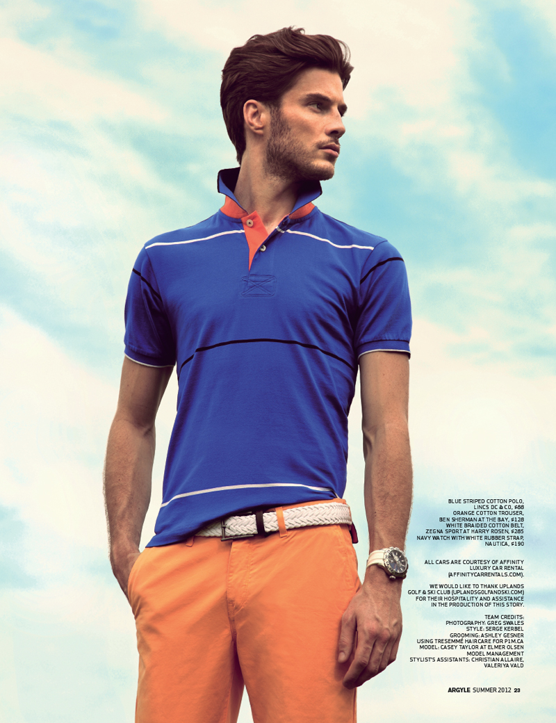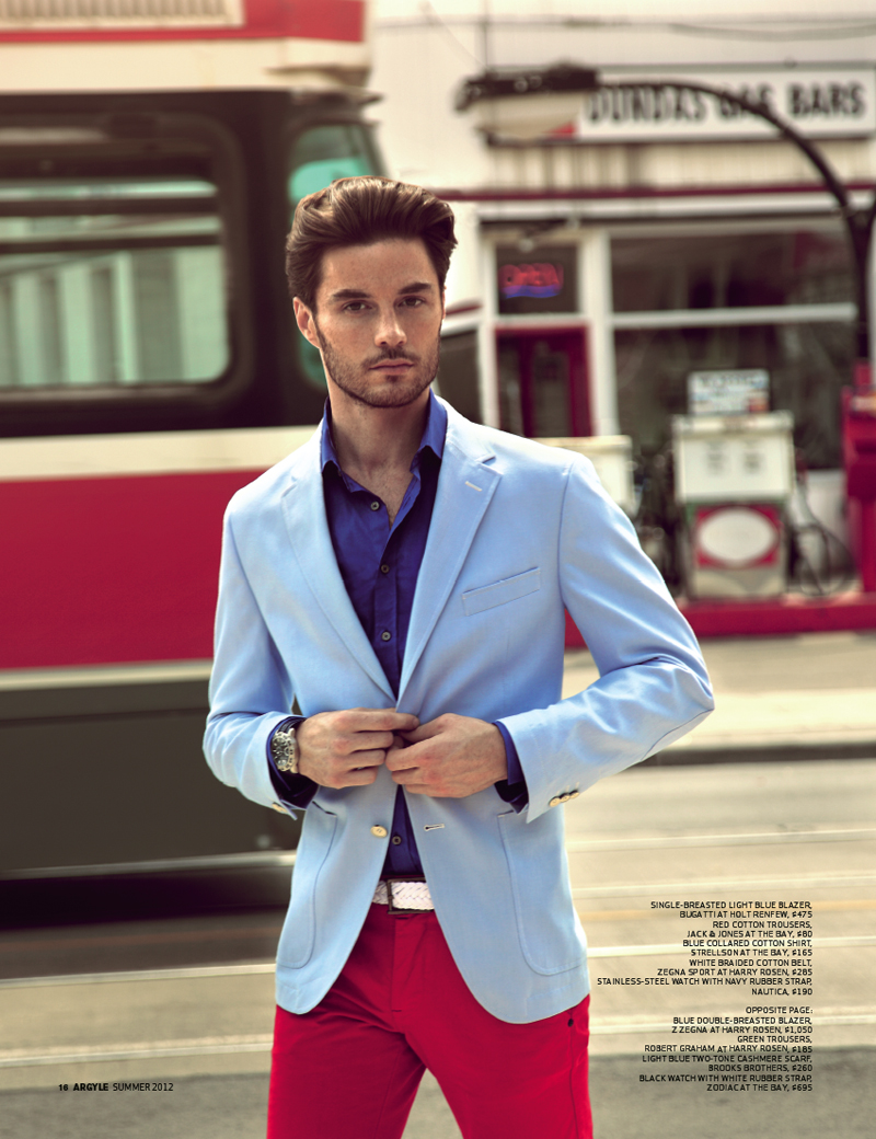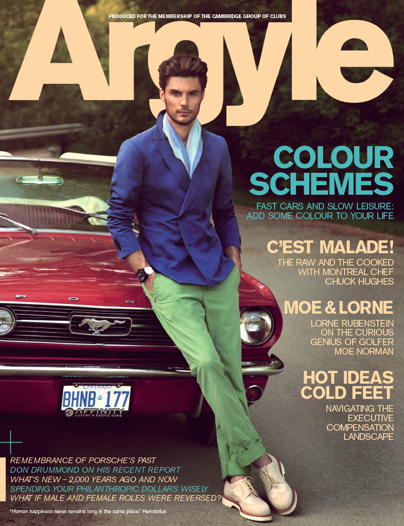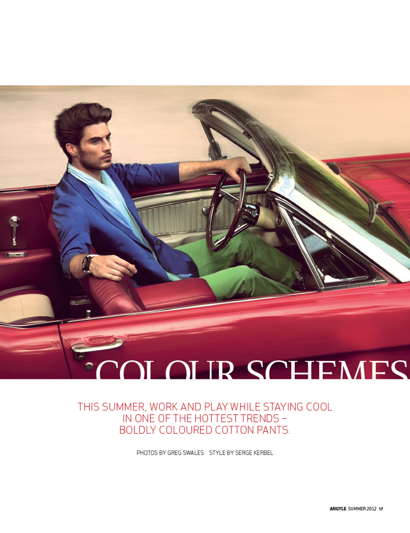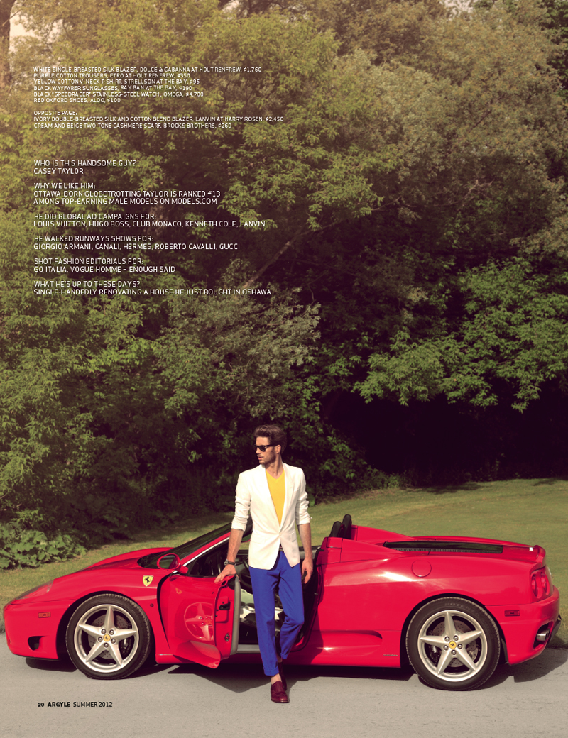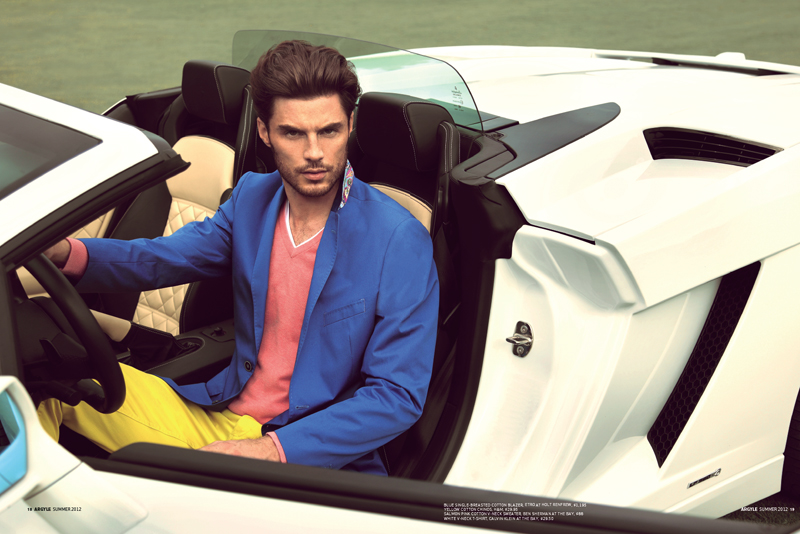 Flying Colors–Calm and collected, Casey Taylor (Elmer Olsen) is the picture of fun elegance in Argyle’s color-packed story styled by Serge Kerbel. Shot by Greg Swales, the suave model is unafraid of color, posing naturally with an impressive collection of cars and dashing labels such as Brooks Brothers, Etro, Dolce & Gabbana, and Lanvin. / Grooming by Ashley Gesner.