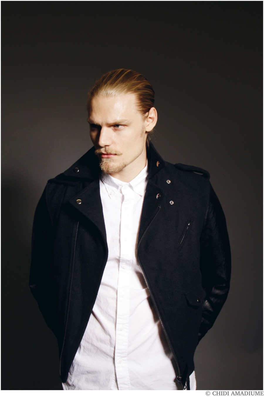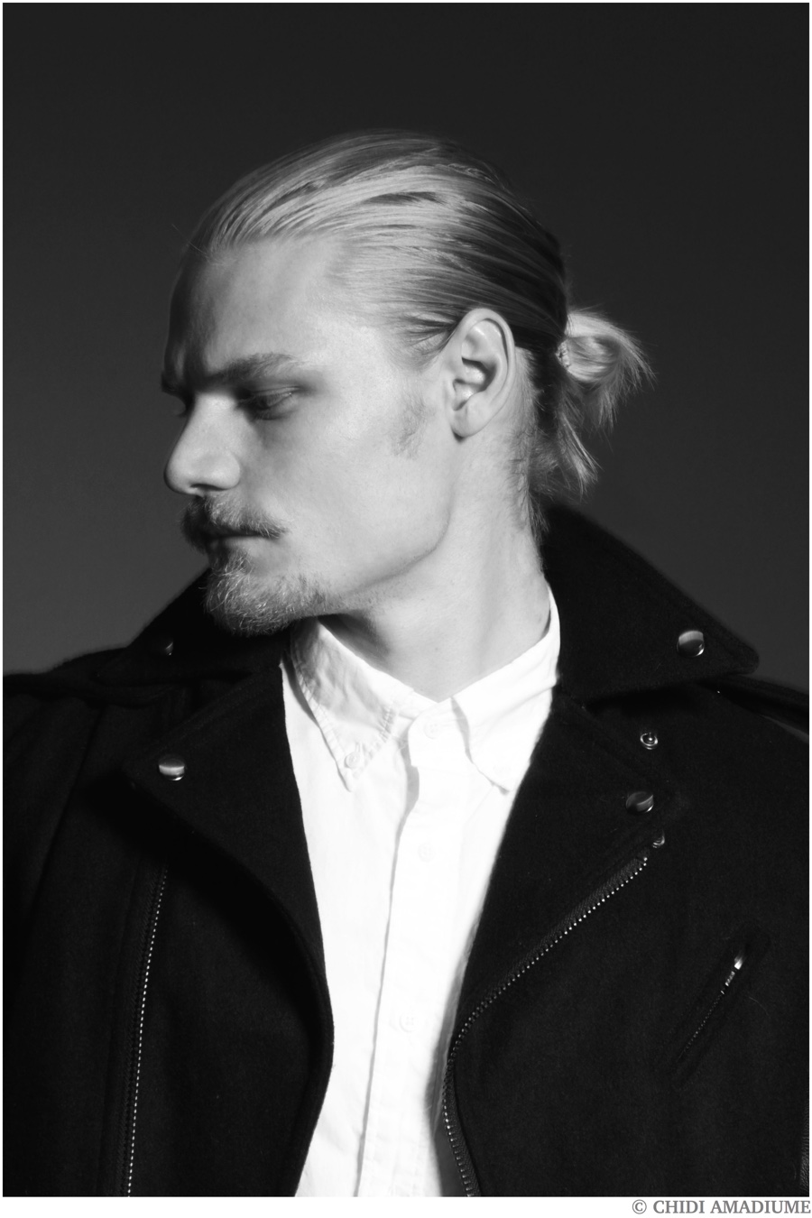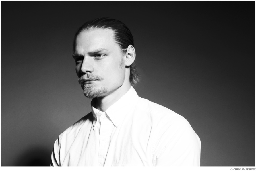 Fusion model Caspar Peteus is front and center for a new series of images from photographer Chidi Amadiume. Tying his hair back, Caspar poses for serious photos in a classic, tailored overcoat. Letting his hair down, Caspar sits for relaxed shirtless portraits that offer a more intimate appeal.