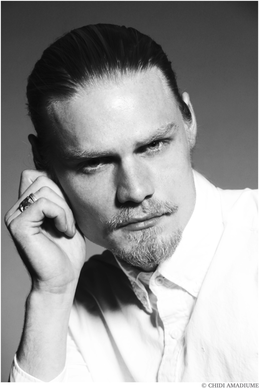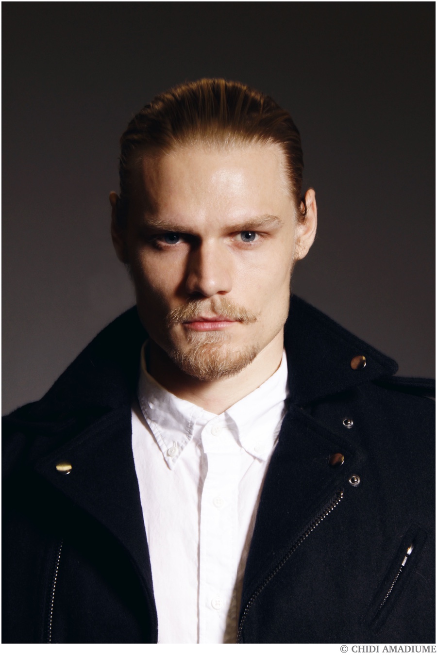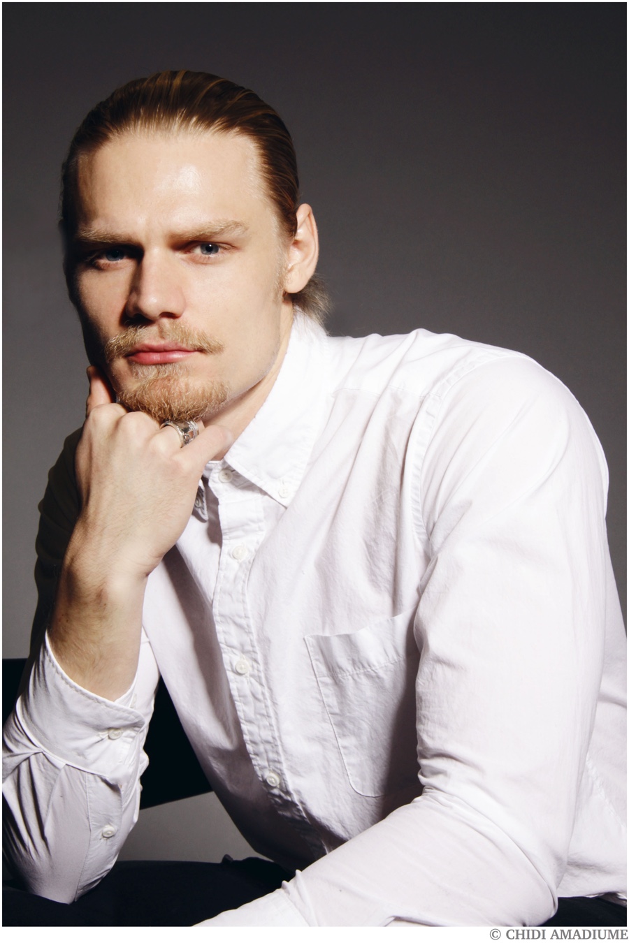 Fusion model Caspar Peteus is front and center for a new series of images from photographer Chidi Amadiume. Tying his hair back, Caspar poses for serious photos in a classic, tailored overcoat. Letting his hair down, Caspar sits for relaxed shirtless portraits that offer a more intimate appeal.