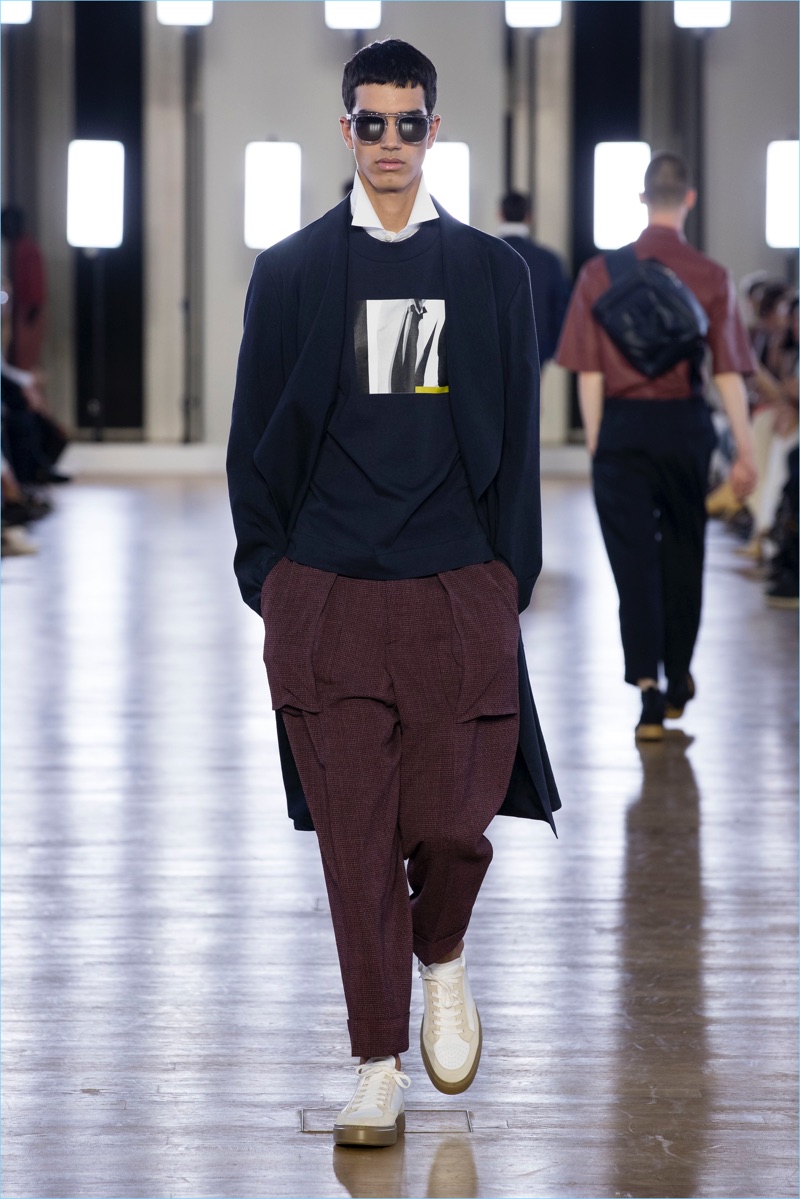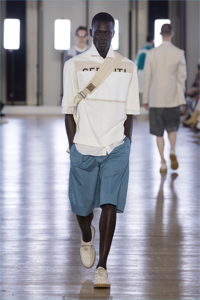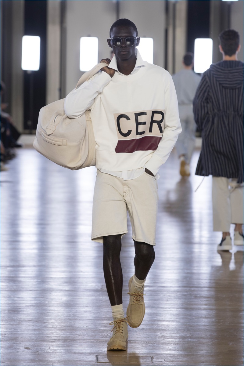 Tailoring, which the Cerruti man chooses for pleasure rather than out of a sense of obligation, takes on a related flowing silhouette this season. The oversized unlined double-breasted jackets are worn over T-shirts or V-neck shirts, with bermudas, or are simply swapped for loose easy summer coats. There is a playful mix of stripes, and a palm leaf pattern is worked into the collection in a variety of ways – printed on shirts, woven into knitwear, and on jacquard pieces – injecting a burst of pop energy into oversized silhouettes inspired by the 80s. The Cerruti logo in ultra-graphic form, is reinvented on T-shirts and sweatshirts.