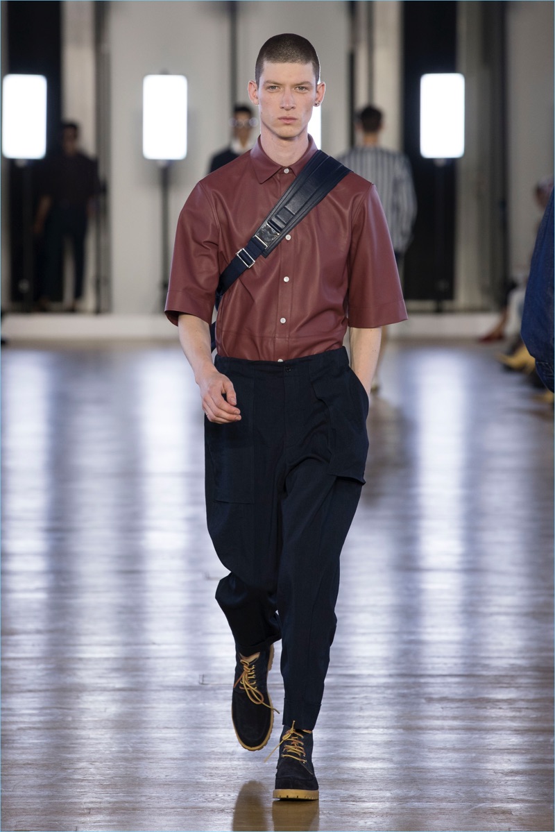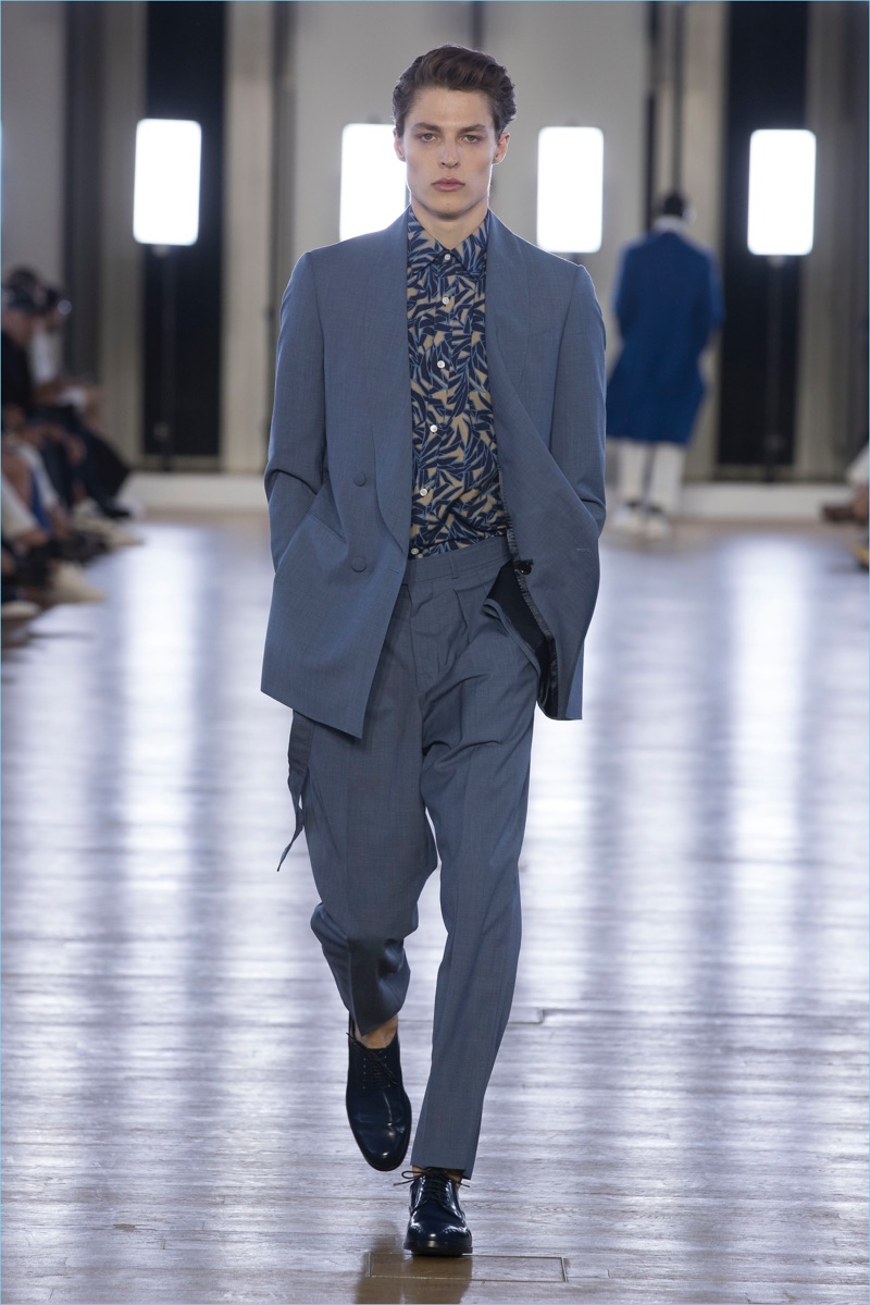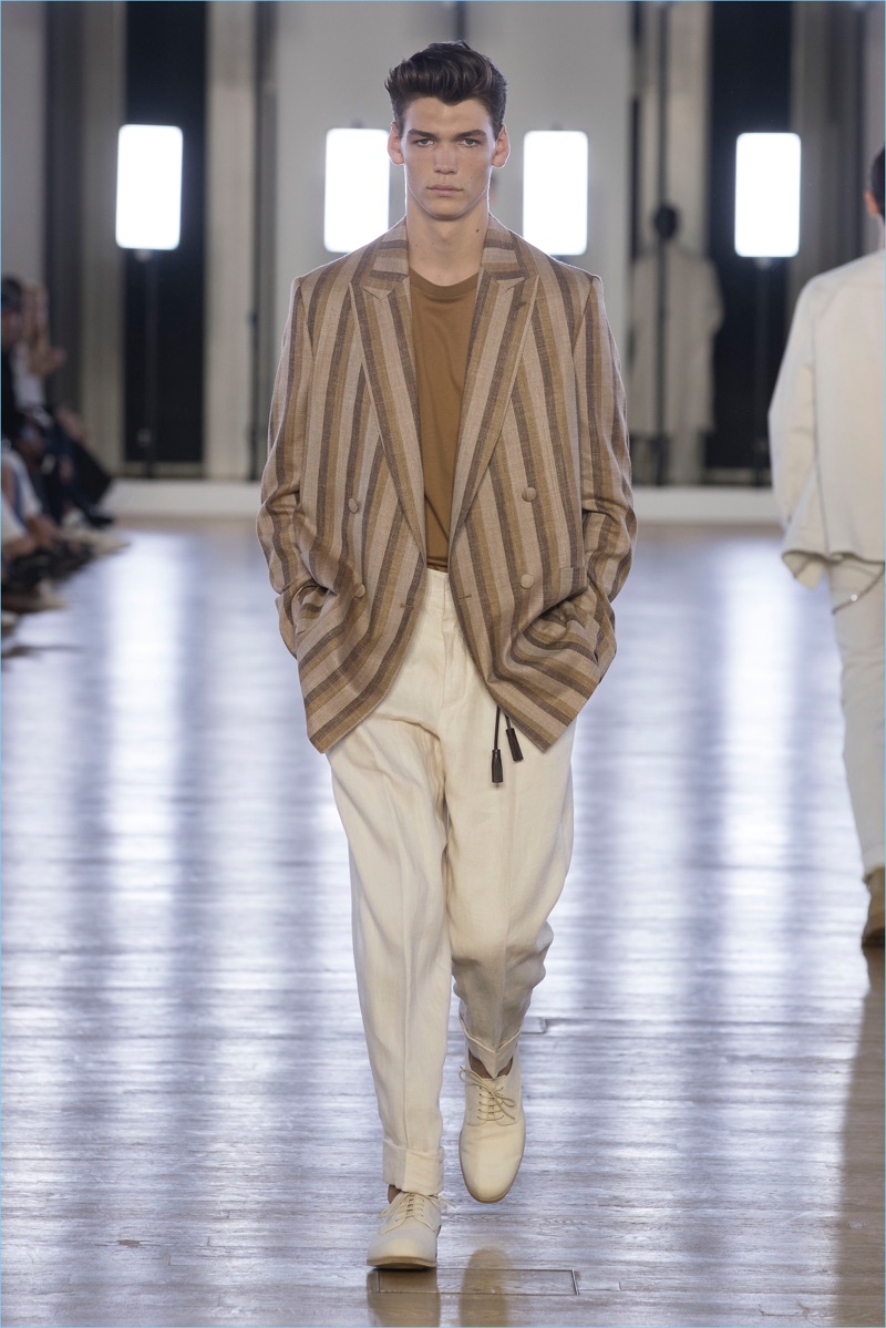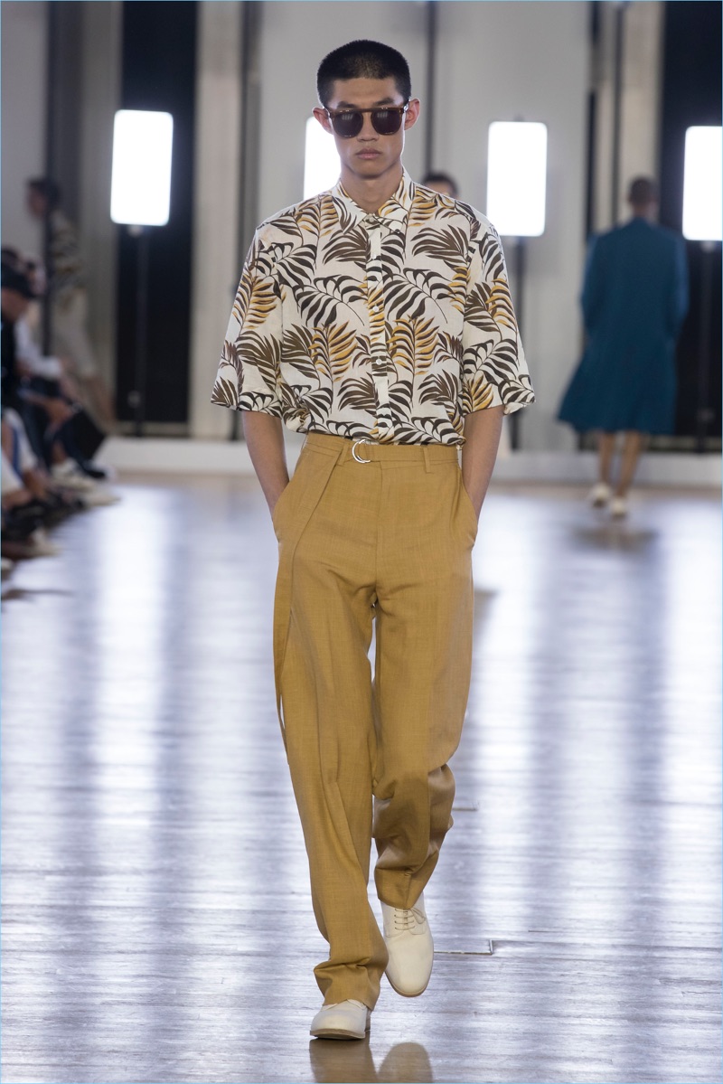 Tailoring, which the Cerruti man chooses for pleasure rather than out of a sense of obligation, takes on a related flowing silhouette this season. The oversized unlined double-breasted jackets are worn over T-shirts or V-neck shirts, with bermudas, or are simply swapped for loose easy summer coats. There is a playful mix of stripes, and a palm leaf pattern is worked into the collection in a variety of ways – printed on shirts, woven into knitwear, and on jacquard pieces – injecting a burst of pop energy into oversized silhouettes inspired by the 80s. The Cerruti logo in ultra-graphic form, is reinvented on T-shirts and sweatshirts.
