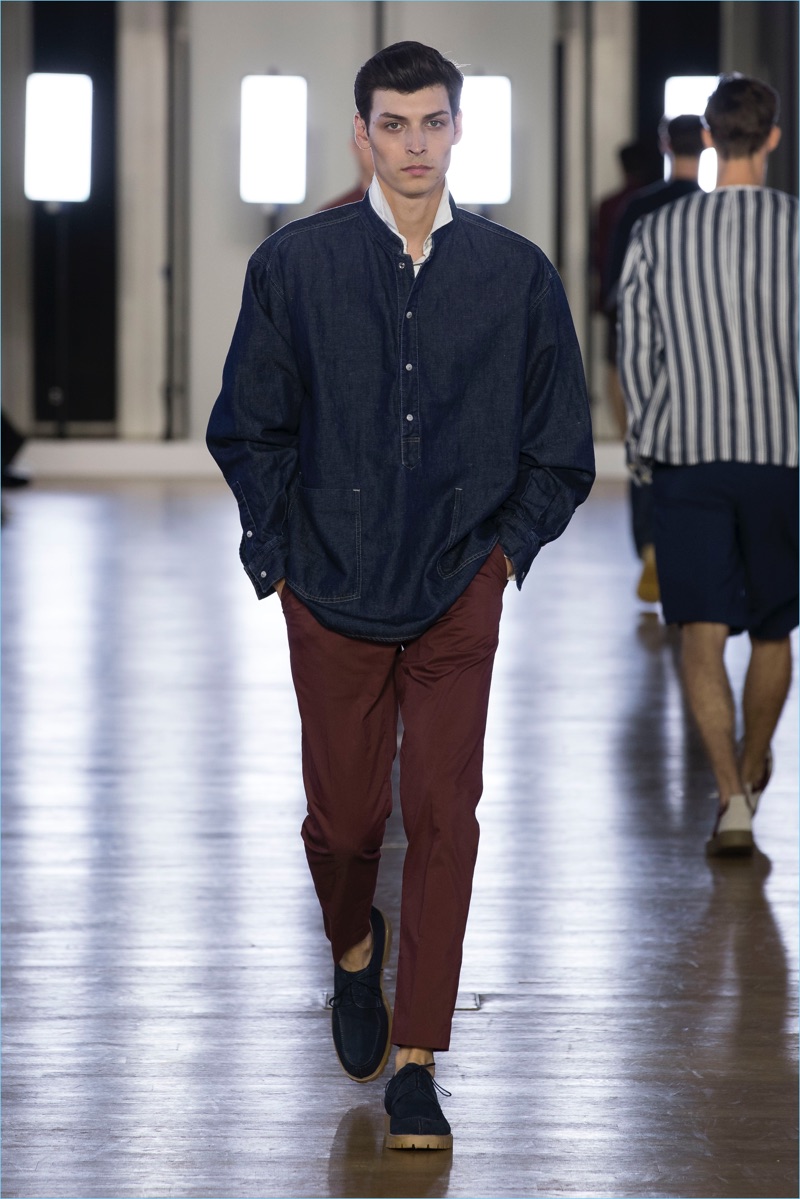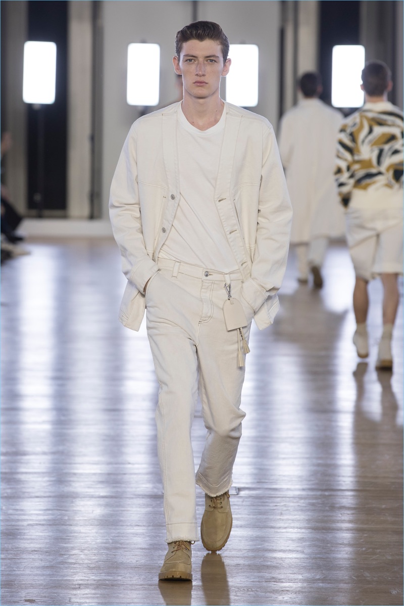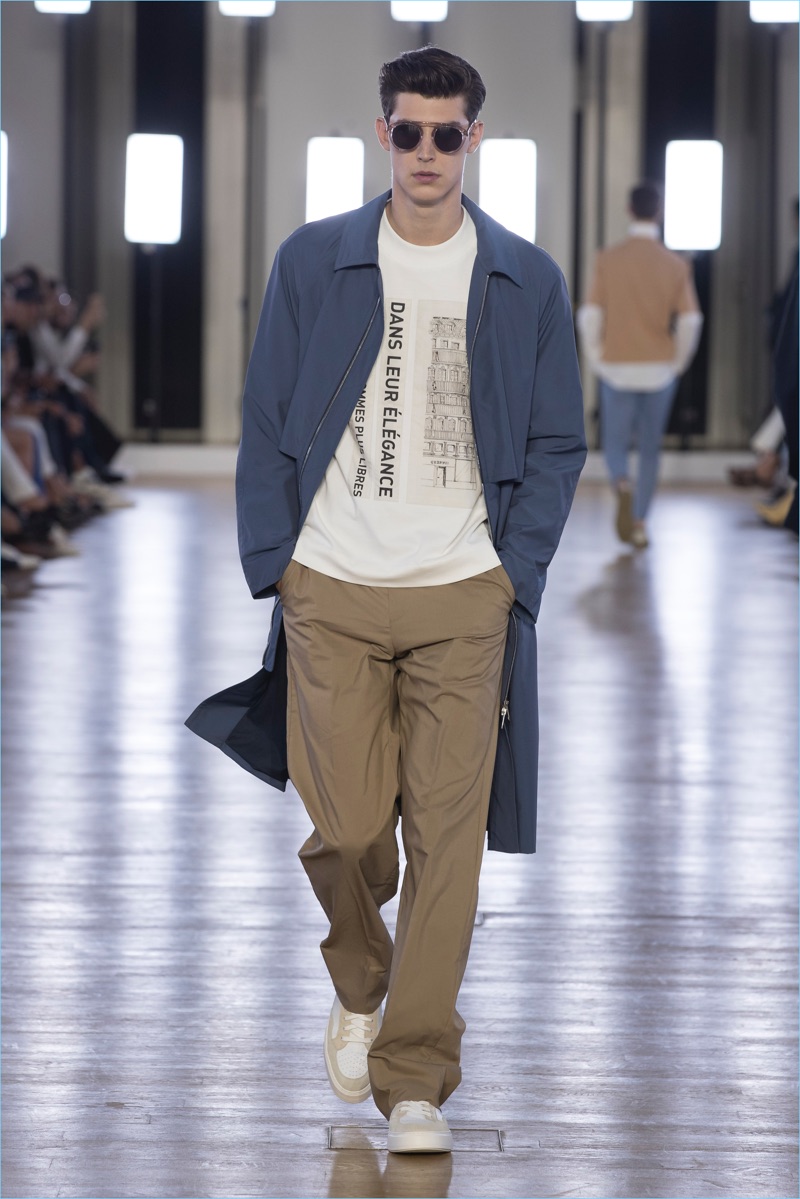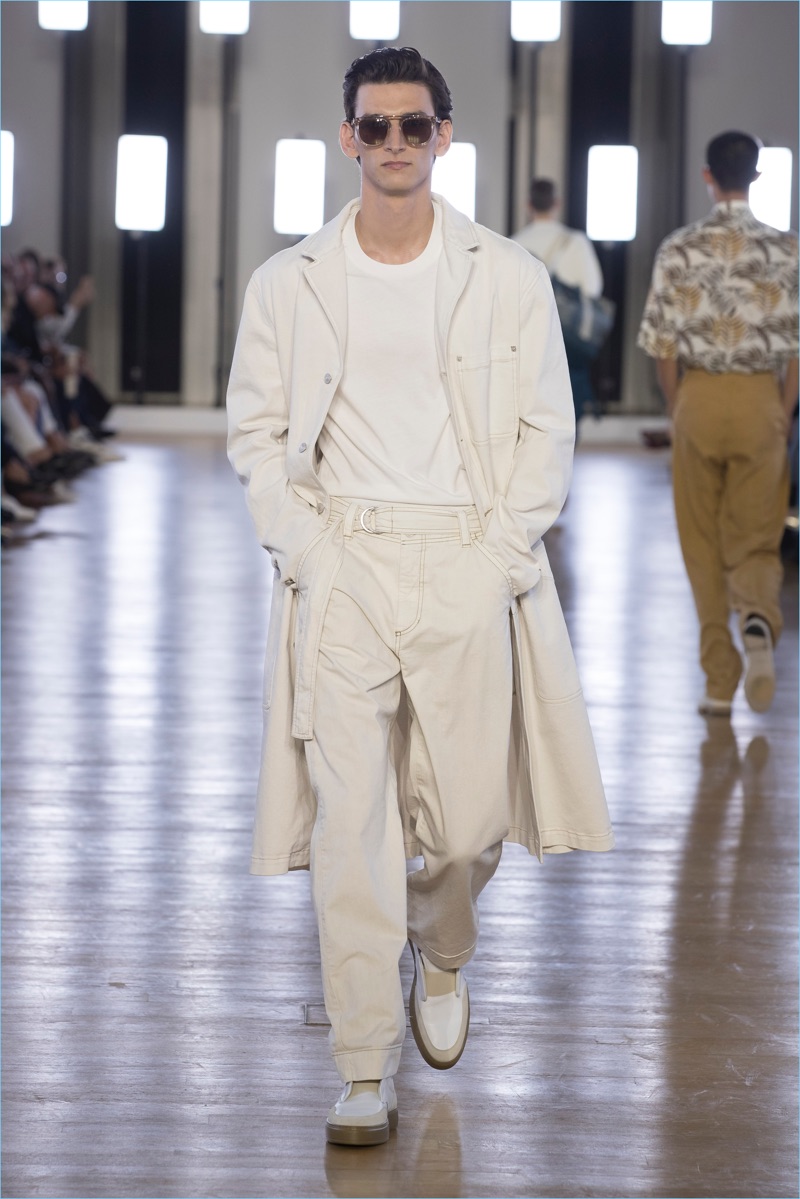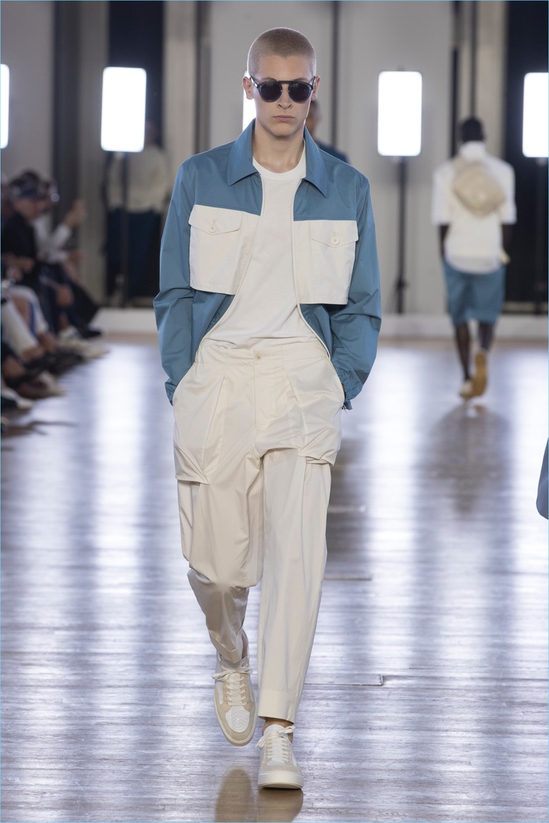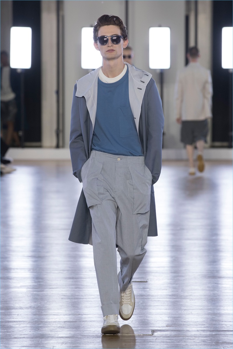 Denim comes into its own this season, too, in ultra-faded or striped versions, in the form of items given a new twist, like a jumpsuit or hooded poncho. As with the tailored wear, it is paired with colour-blocked sneakers, or suede lace up shoes or boots with natural rubber soles.