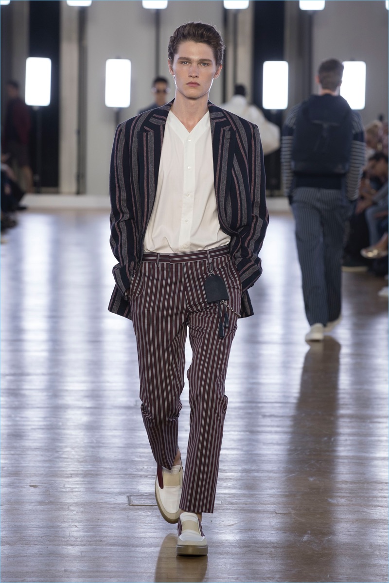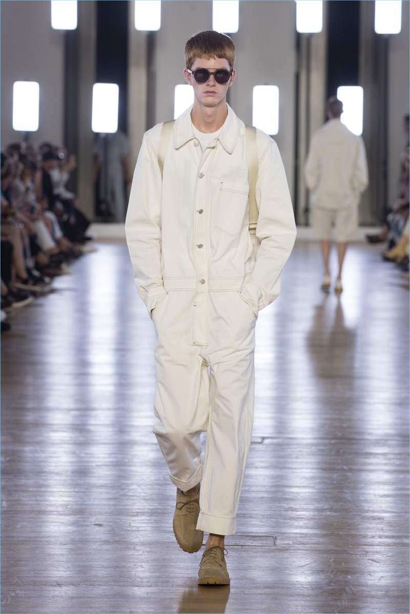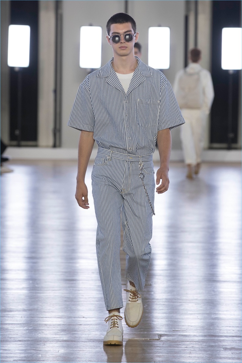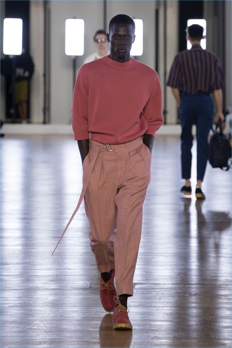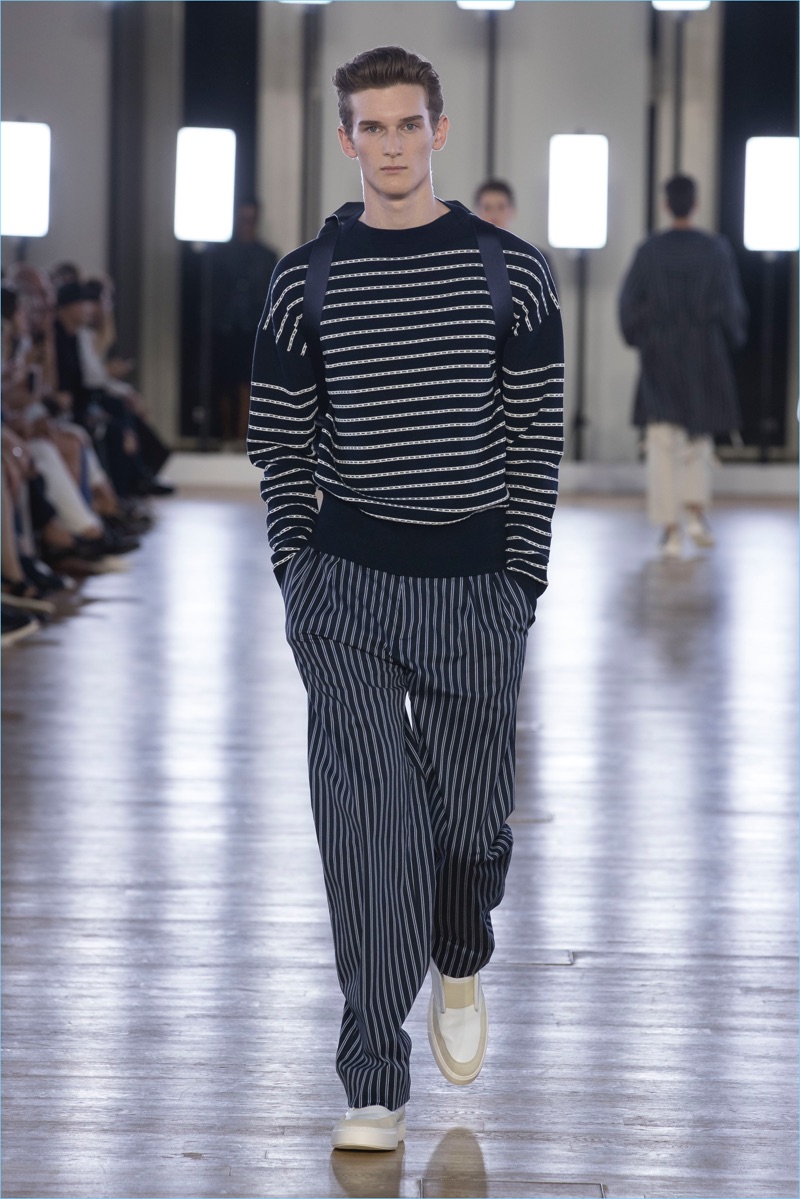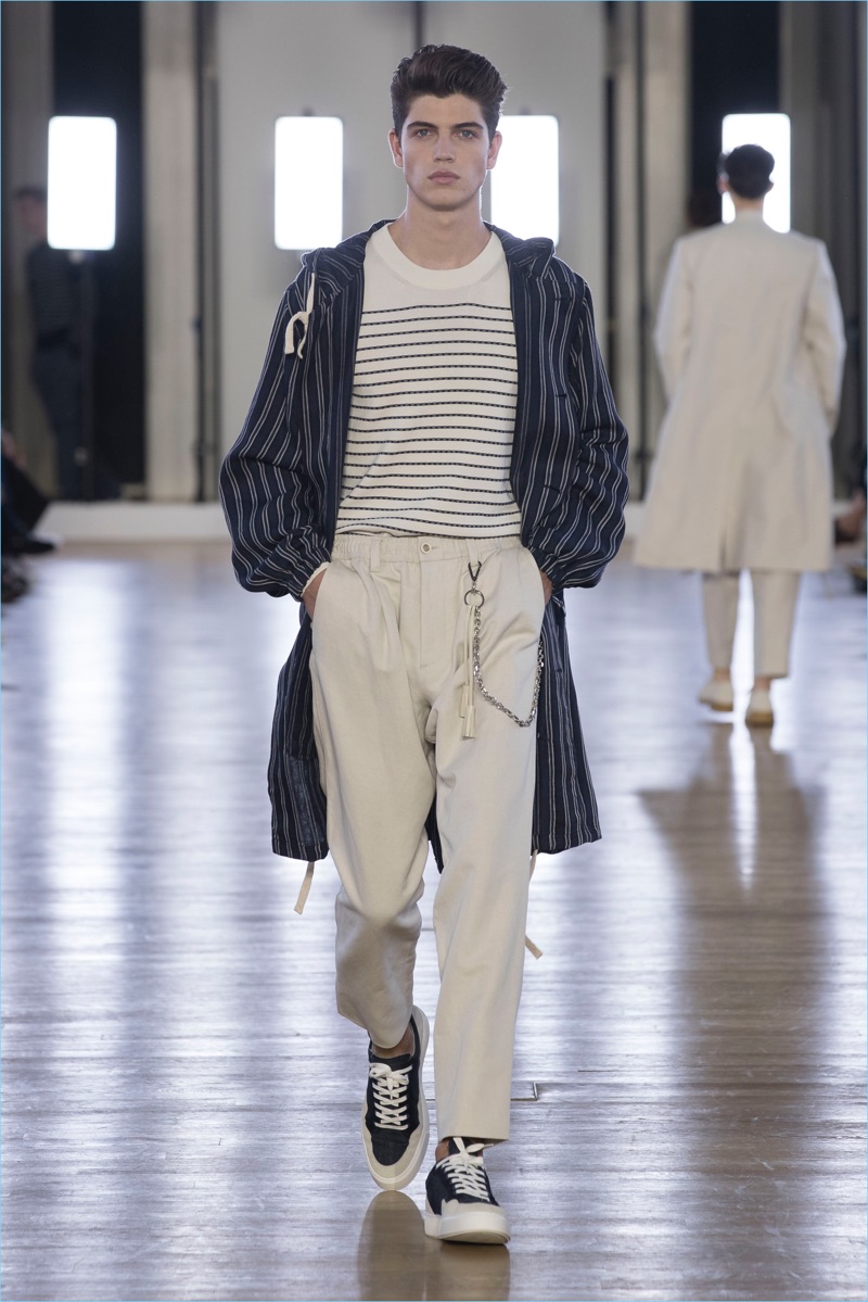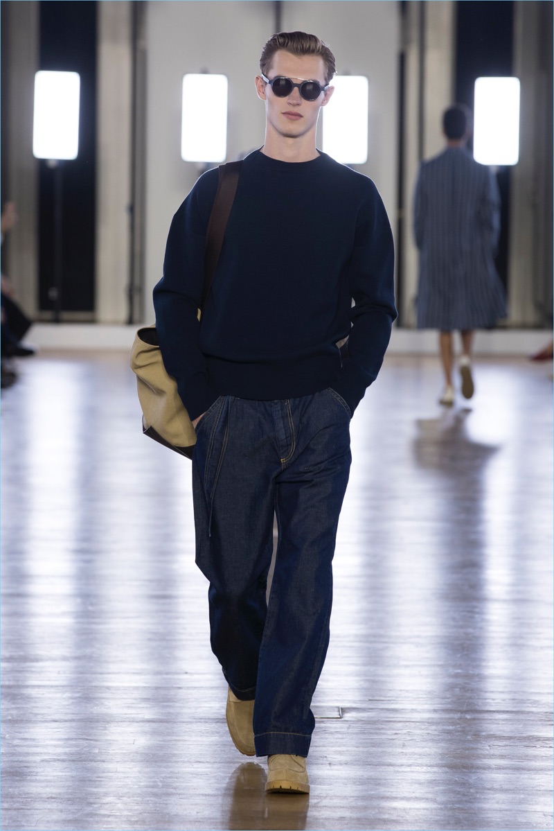 Denim comes into its own this season, too, in ultra-faded or striped versions, in the form of items given a new twist, like a jumpsuit or hooded poncho. As with the tailored wear, it is paired with colour-blocked sneakers, or suede lace up shoes or boots with natural rubber soles.