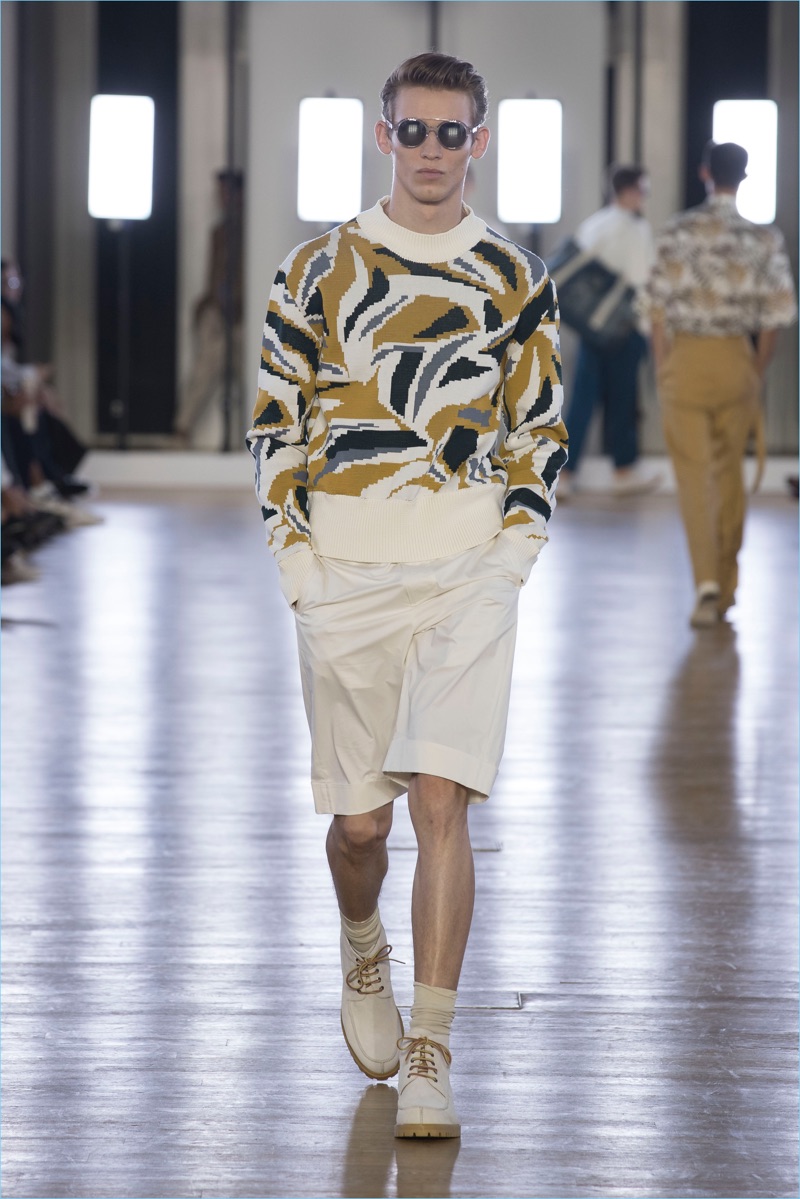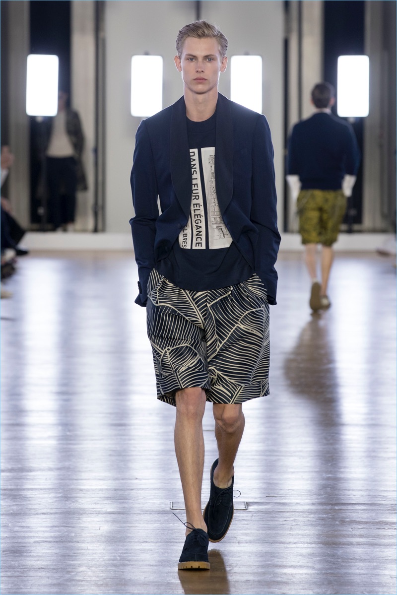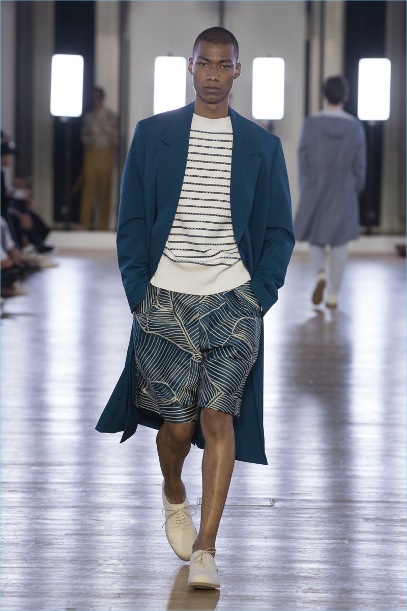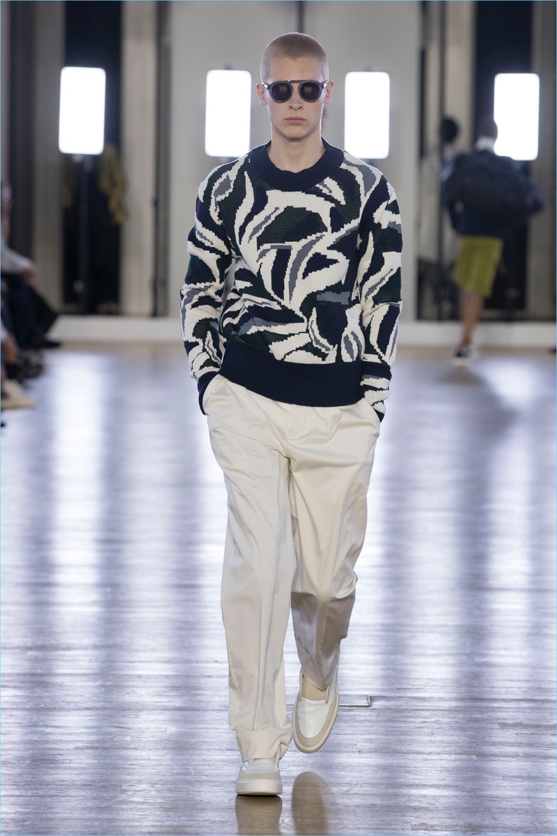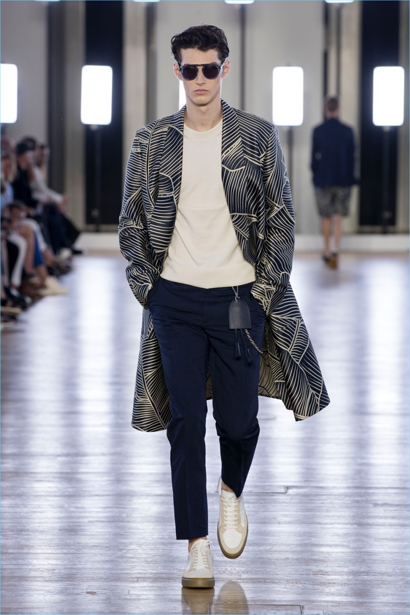 Eighties television classic Miami Vice is in the spotlight once more as Cerruti 1881 unveils its spring-summer 2018 collection. Designer Jason Basmajian revisits the iconic looks designed by Nino Cerruti for the show in 1984. Here, relaxed tailoring comes together with a light color palette of cream with splashes of lime and ocean. Cerruti’s man of style is a sleek vision as he mixes and matches separates with an effortless hand. The collection turns out an irresistible selection of graphic knitwear, patterned shirts, oversize coats, printed shorts, and more.