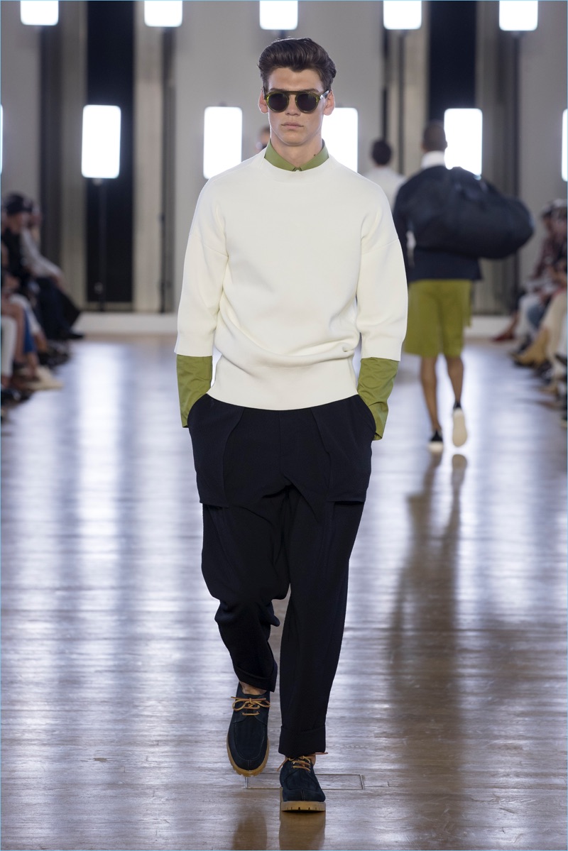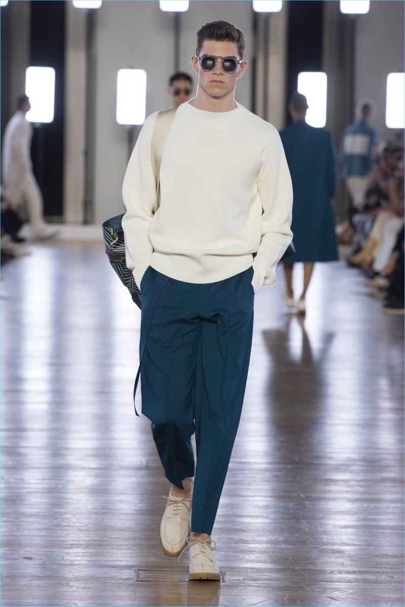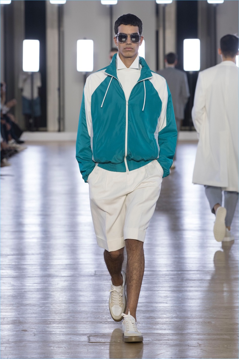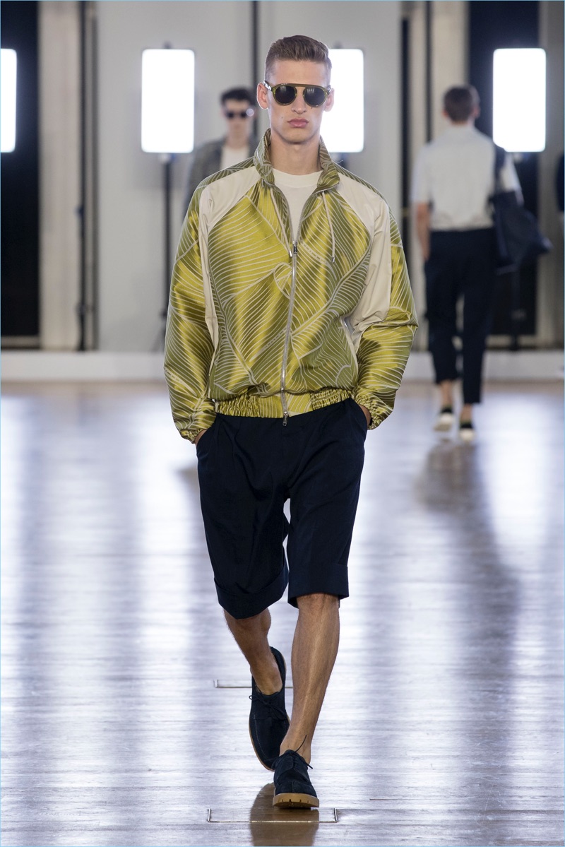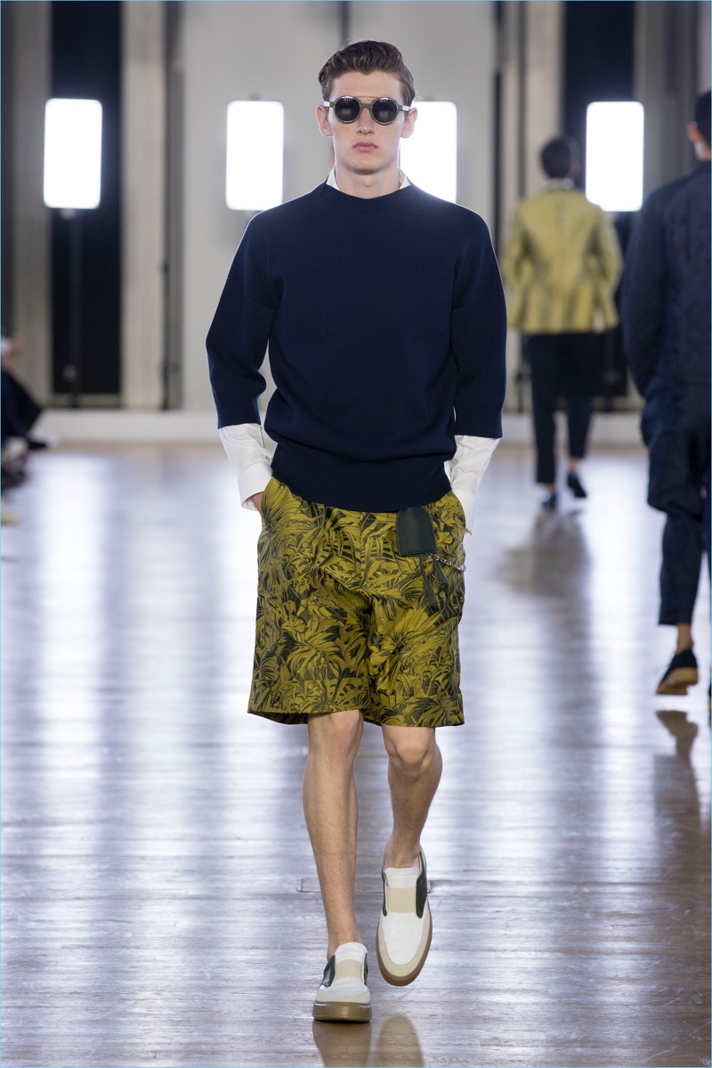 Eighties television classic Miami Vice is in the spotlight once more as Cerruti 1881 unveils its spring-summer 2018 collection. Designer Jason Basmajian revisits the iconic looks designed by Nino Cerruti for the show in 1984. Here, relaxed tailoring comes together with a light color palette of cream with splashes of lime and ocean. Cerruti’s man of style is a sleek vision as he mixes and matches separates with an effortless hand. The collection turns out an irresistible selection of graphic knitwear, patterned shirts, oversize coats, printed shorts, and more.