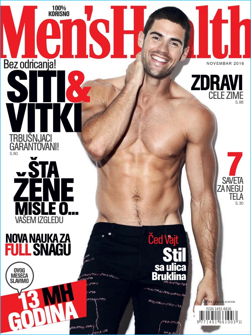 A shirtless Chad White is all smiles for the November 2016 cover of Men’s Health Serbia.
