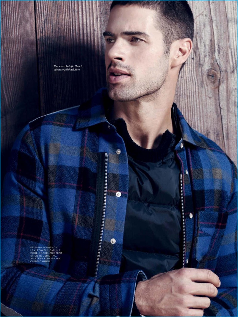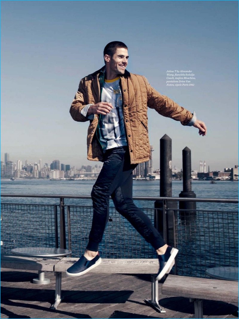 American model Chad White sports a Nautica jacket and MK Michael Kors boots with a sweater and pants from Moschino.