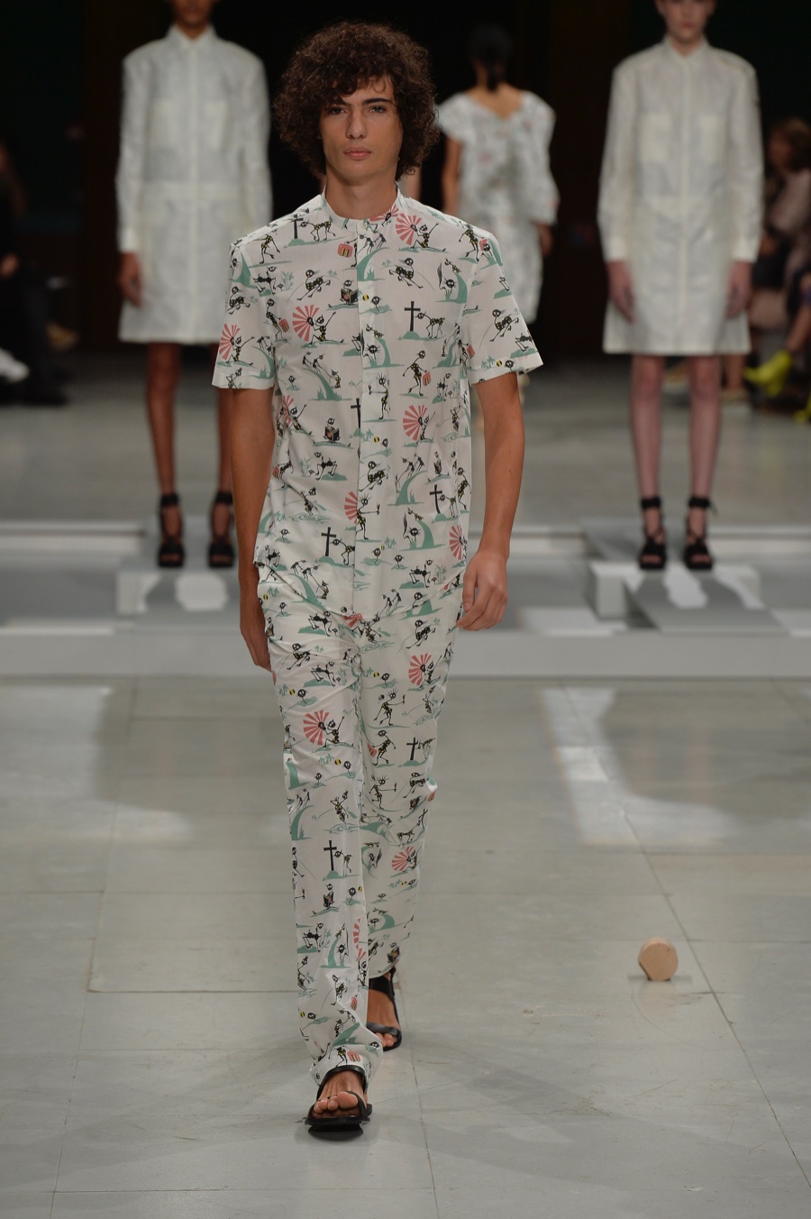 Piero Mendez, Adrien Sahores and Nicolas Ripoll recently hit the catwalk, modeling a sampling from Chalayan’s spring-summer 2016 collection. The quirky outing looks to improved relations between Cuba and the United States for inspiration. Blending various references, military-inspired details come together with a whimsical, celebratory attitude, delivering boxy, tailored shapes.