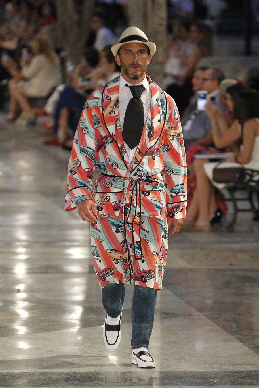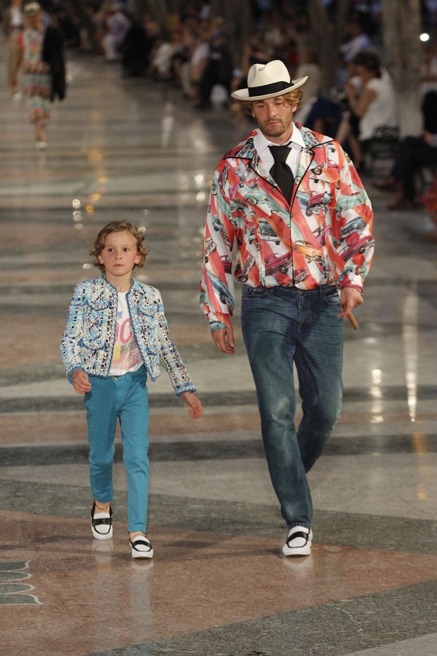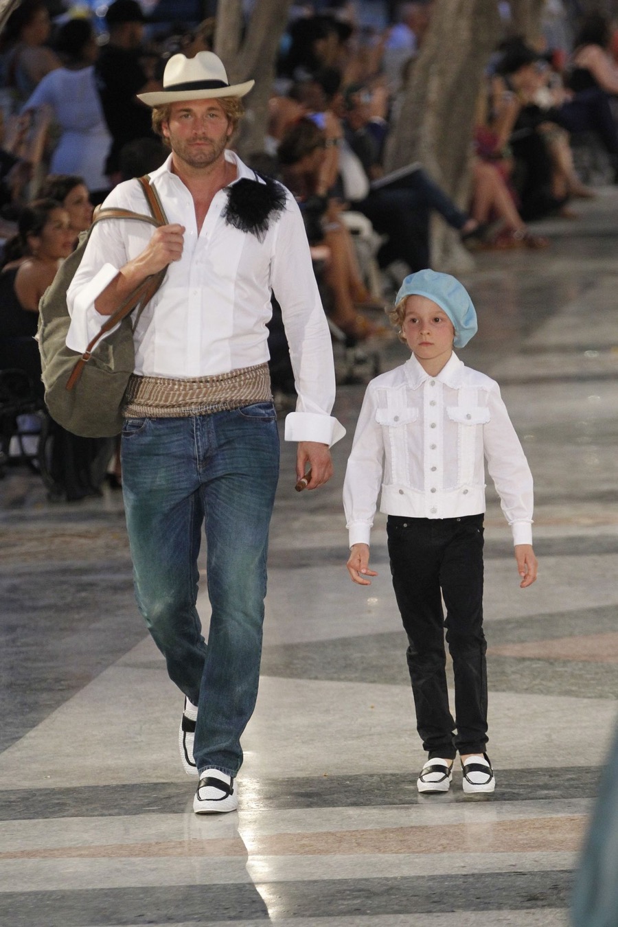 Wearing denim jeans and a white dress shirt, Karl Lagerfeld muse Brad Kroenig takes to the catwalk with his son.